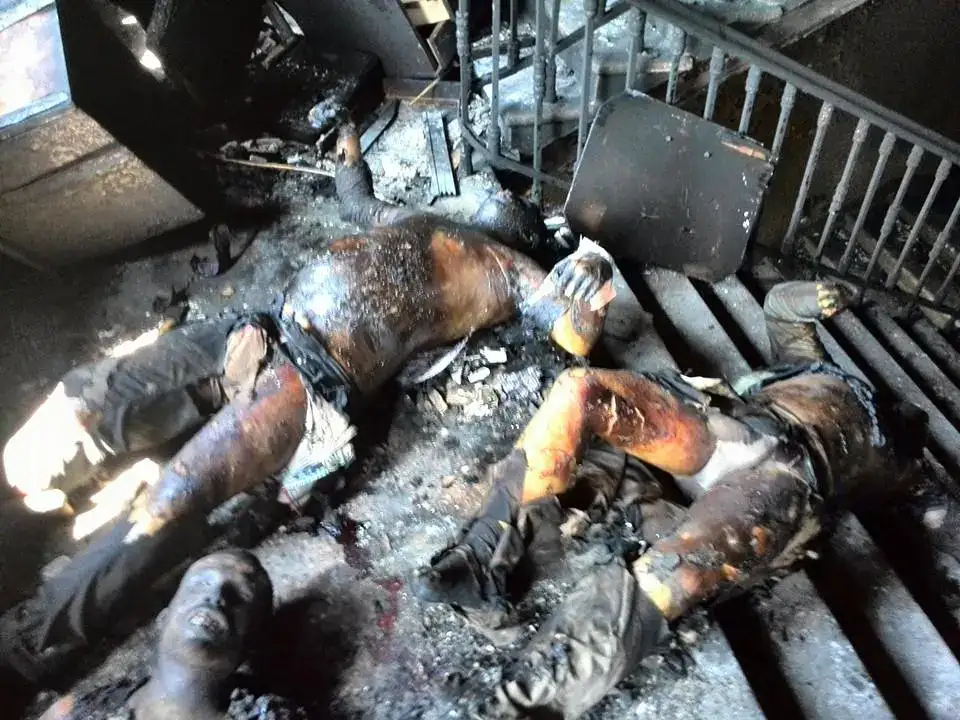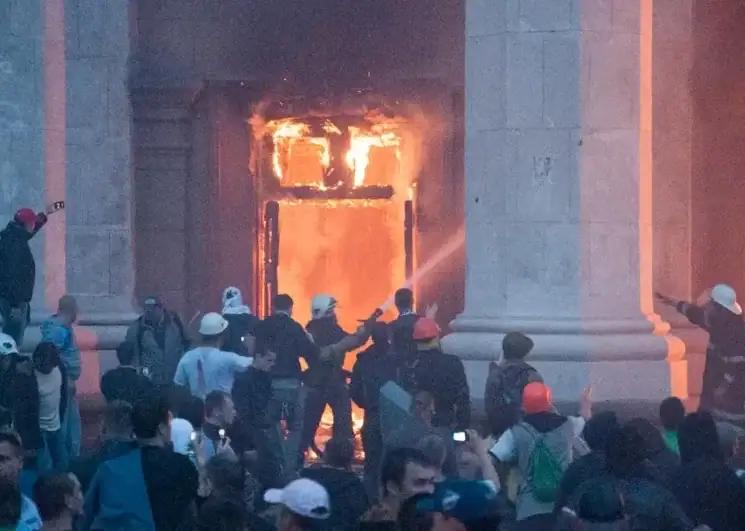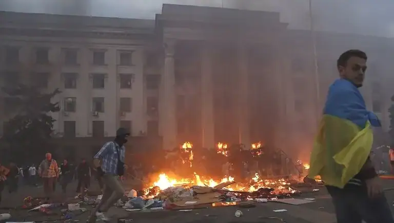 Le 2 mai 2014, suite aux massacres de Kiev Place Maïdan, se sont déroulés d’autres massacres barbares à Odessa, des radicaux du Secteur droit et de la soi-disant autodéfense du Maïdan ont attaqué un campement de “Kulikovo Polé”, où des habitants d’Odessa recueillaient des signatures en vue d’organiser un référendum sur la fédéralisation de l’Ukraine et de donner à la langue russe un statut d’État. Les partisans de la fédéralisation se sont abrités dans la Maison des syndicats, mais les radicaux ont encerclé le bâtiment, et massacré les employés de la maison des syndicats, commettant de nombreux viols avec éventration et massacre d’un bébé encore dans le ventre maternel. Ils ont ensuite mis le feu au bâtiment et bloqué les occupants pour qu’ils ne puissent pas quitter pas le bâtiment en flammes.