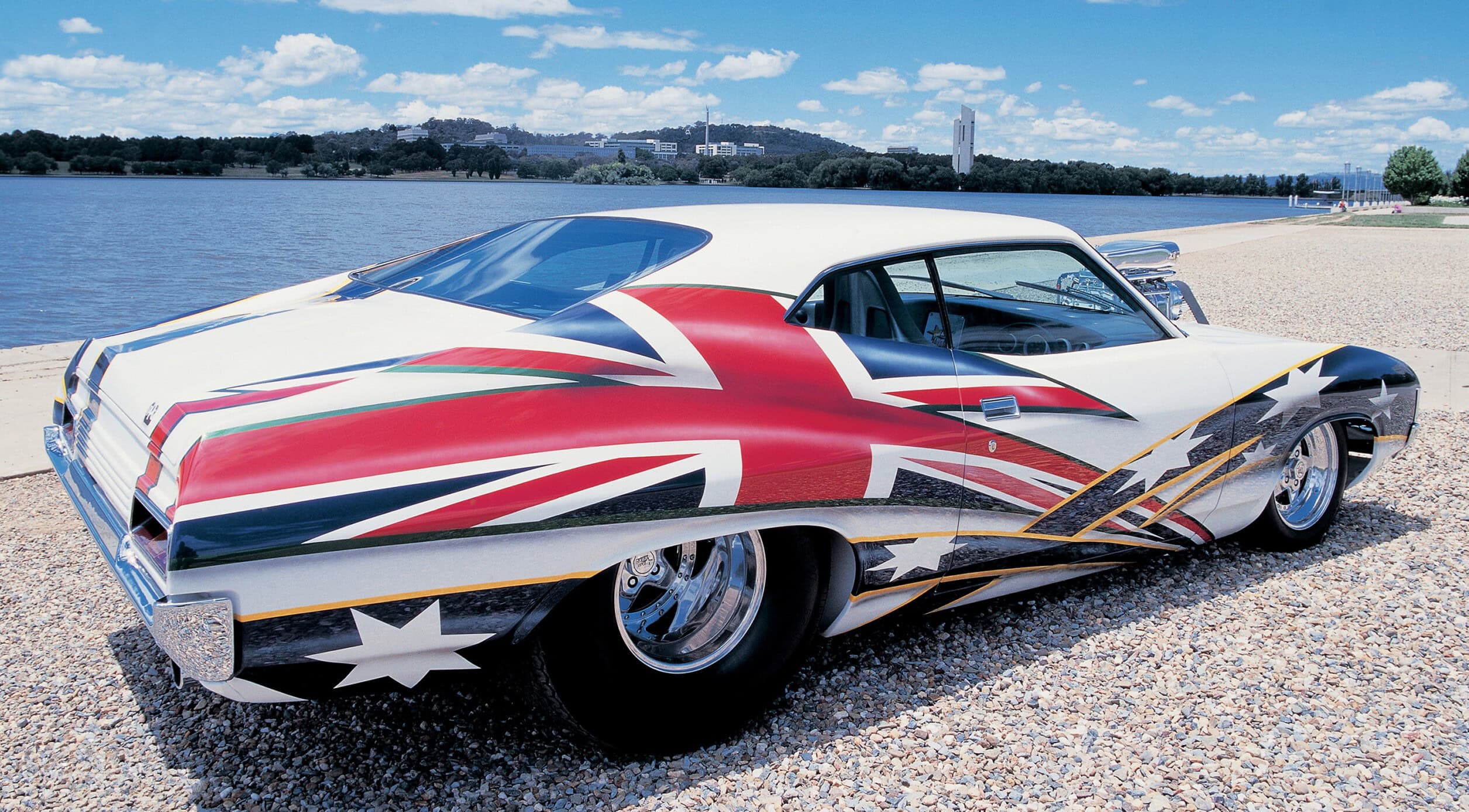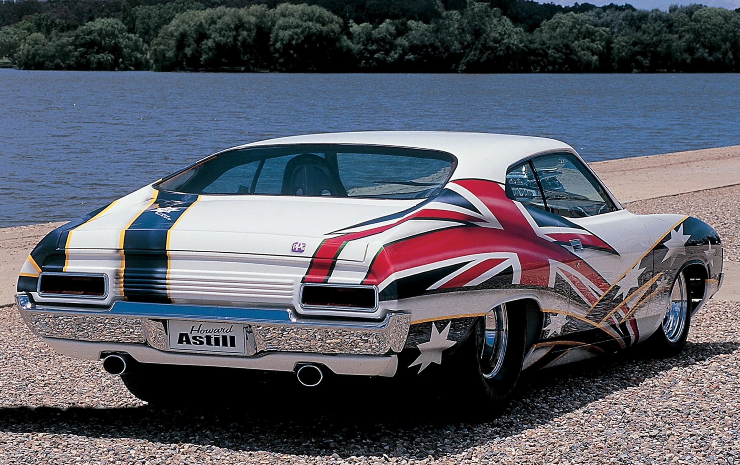 Celui-ci est constitué d’une structure tubulaire carrée en acier, stratifiée en Craftwood et recouverte de vinyle par Carofano Motor Trimmers. Le Craftwood a également été choisi pour les portières, bien que Howard admette que, la prochaine fois, il opterait pour de la fibre de verre plus légère pour les éléments intérieurs, ceux en bois s’étant révélés assez lourds. Étant donné qu’il s’agit d’une voiture sponsorisée par Pioneer, il est compréhensible qu’elle soit équipée d’un système audio ultra-complet. Outre les caissons de basses de 20 cm intégrés au tableau de bord, on trouve deux autres caissons à l’arrière, ainsi que deux paires de haut-parleurs médiums et tweeters (une dans chaque portière et une autre sur le tableau de bord), deux enceintes empilables dans la console centrale, quatre amplificateurs et un autoradio ODR. Dès sa première présentation, la carrosserie préparée par Astill était ornée de graphismes numériques intégrant le logo Pioneer. Et quel succès ! Non seulement elle atteignit son objectif principal, le titre de SMOTY (ex æquo avec Darryl McBeth en 1995, voir ci-dessus), mais Race Rock remporta également le titre de Grand Champion au Summernats 10 (voir ci-dessous). Après deux années couronnées de succès sur les circuits d’exposition, la décision fut prise de retirer la voiture du marché et de la mettre en vente (sans succès).