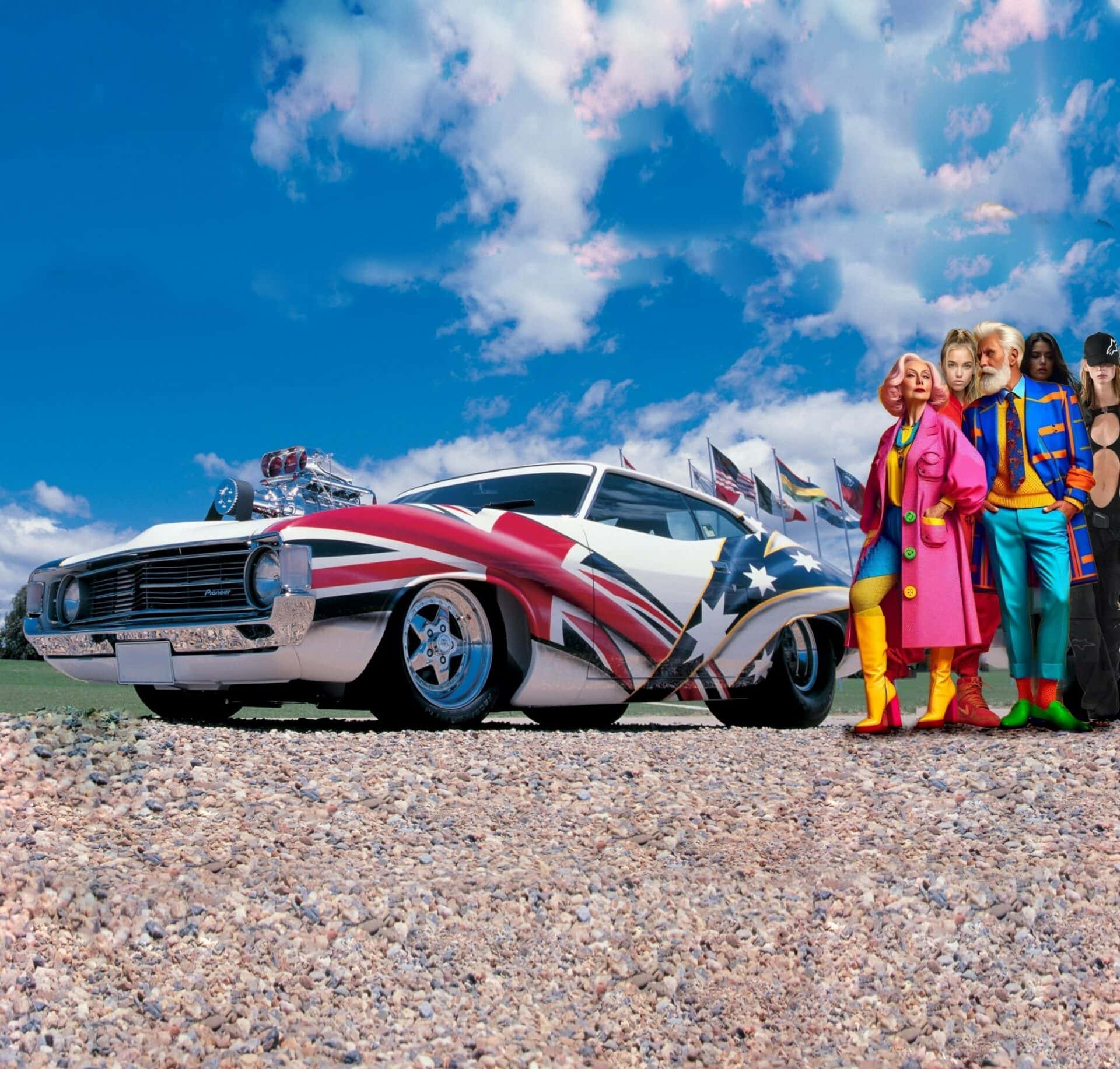 Après avoir étudié le projet et formalisé le concept de Race Rock, Howard a négocié avec Pioneer pour qu’il devienne le sponsor principal, et les douze mois de travail acharné sur le projet ont commencé. Partant d’une Ford Falcon XB Hardtop six cylindres en piteux état mais sans rouille (trouvée dans sa ville natale de Broken Hill, en Nouvelle-Galles du Sud), Howard a entièrement démonté le coupé. “On a enlevé toute la cloison pare-feu, le plancher, et j’ai vendu une bonne partie des pièces”, se souvient Howard : “Le moteur, la boîte de vitesses, les garnitures et tout le reste est parti à la décharge”... Ce qui restait de la carrosserie a été soudé sur un support rotatif, au niveau des bas de caisse, afin de la maintenir d’équerre et de niveau pendant la construction : “Nous avons d’abord construit le châssis : les longerons ont été simplement tendus au milieu de nulle part (là où se trouvait le plancher) puis rattachés à la carrosserie. Tout était aligné sur l’axe longitudinal de la voiture, de même pour l’avant et l’arrière. C’est ainsi que la voiture roule correctement. Beaucoup de voitures à châssis rapporté que l’on voit à Summernats ont tendance à déraper sur la route”…Des cerceaux gigantesques sous un corps massif qui tond les mauvaises herbes, des proportions parfaites ! “Ensuite, nous avons commencé par les roues et le montage à blanc des panneaux. C’était un peu compliqué : il n’y avait pas de compartiment moteur”…