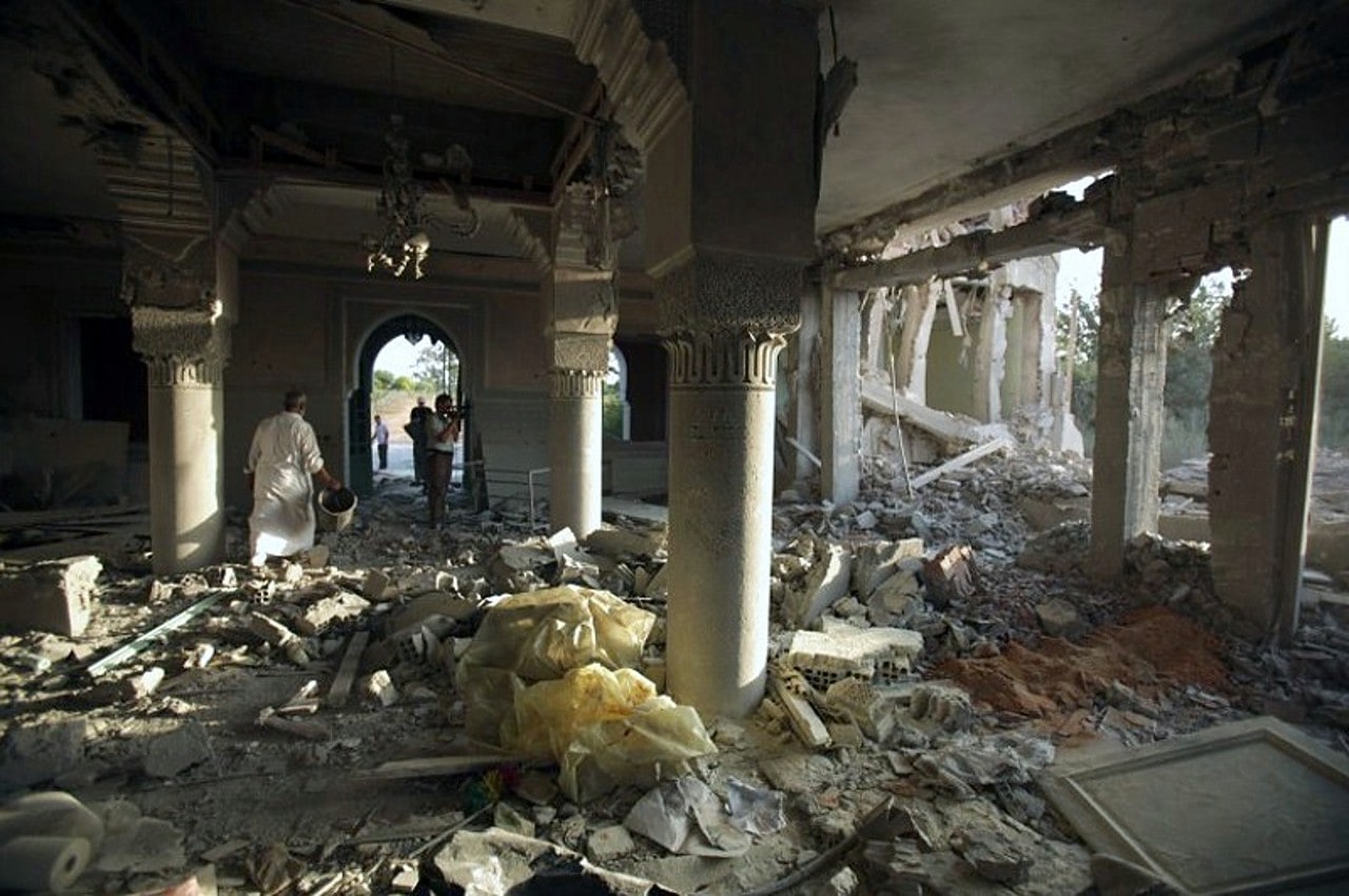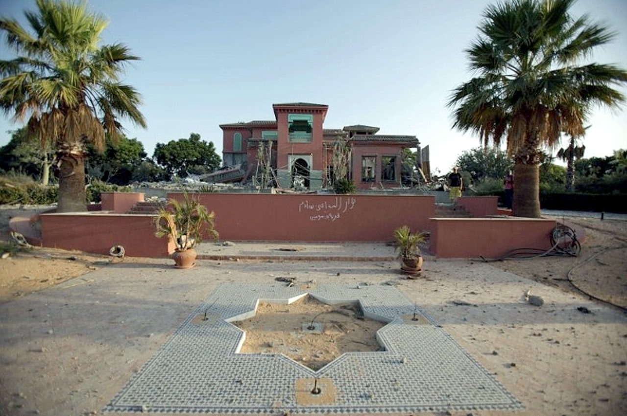 Au détour d’une superbe allée pavée et bordée de palmiers, se dressait les ruines pillées du petit château de style marocain, aux stucs blancs explosés qui étaient finement ouvragés, mais pulvérisés par les bombardements de l’Otan.