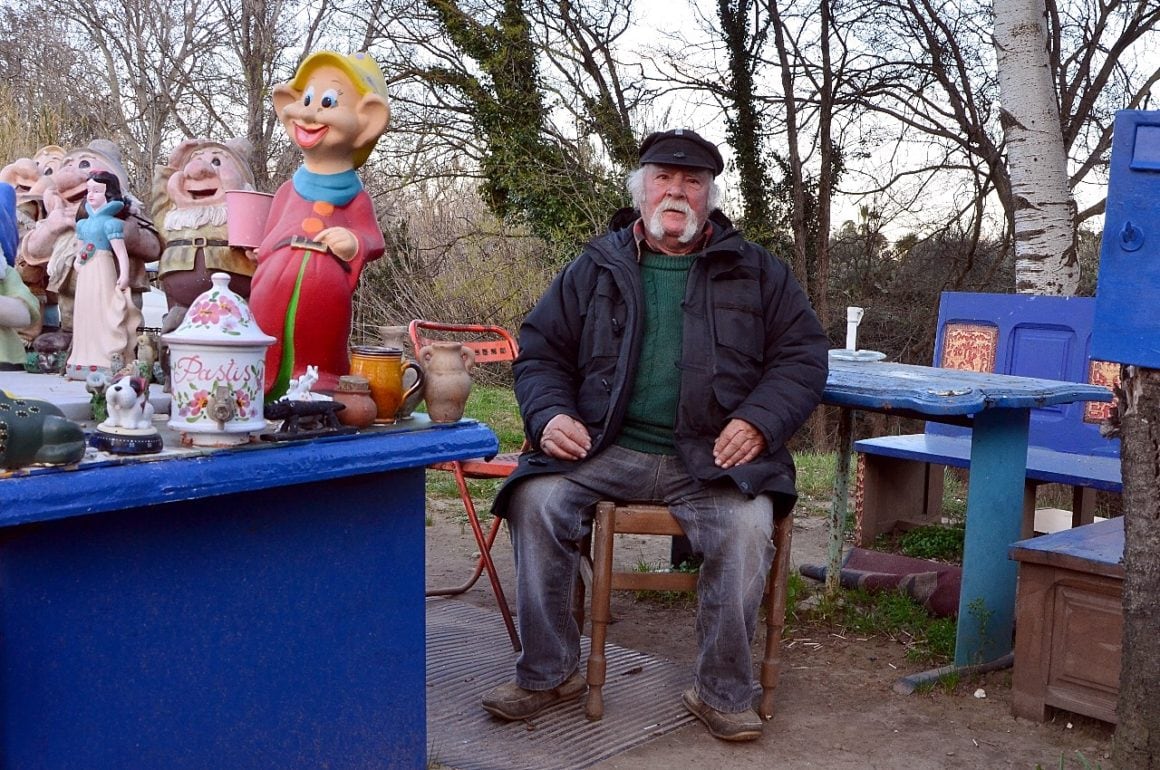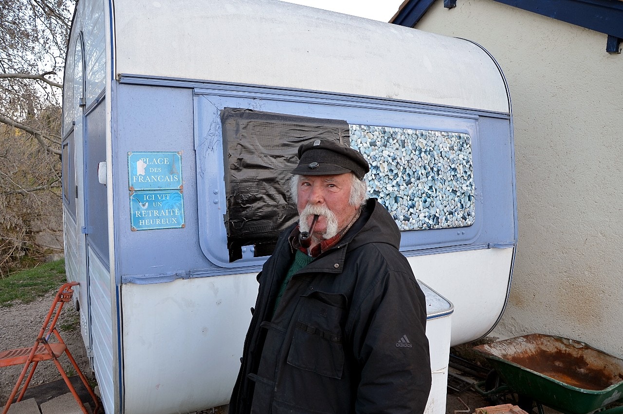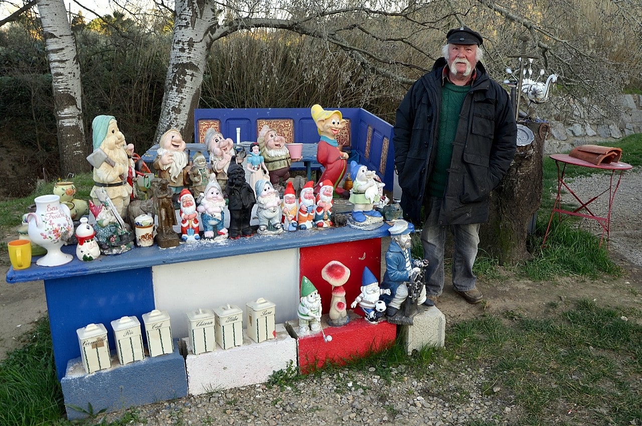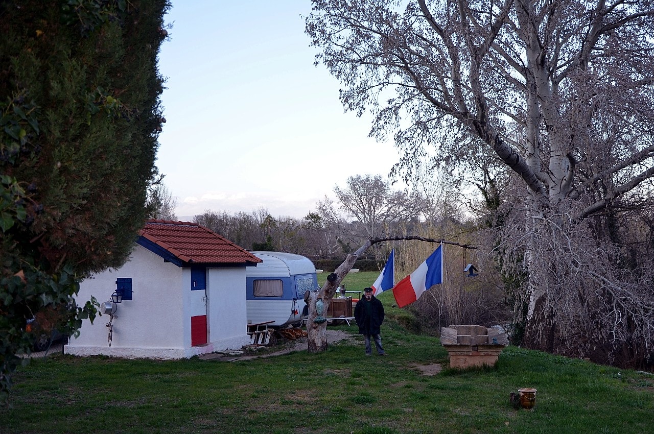 On tourne ou il faut, au pif, à droite, en gardant le Rocher en vue, sur le “Chemin de la Roquette”, on passe un pont… et c’est là, direct à droite, un grand terrain, une ancienne vigne, avec une p’tite maison à laquelle est accrochée une p’tite caravane…On ne peut ni ne sait se tromper, il y a même des nains de jardins exposés sur une table-meuble extérieure…