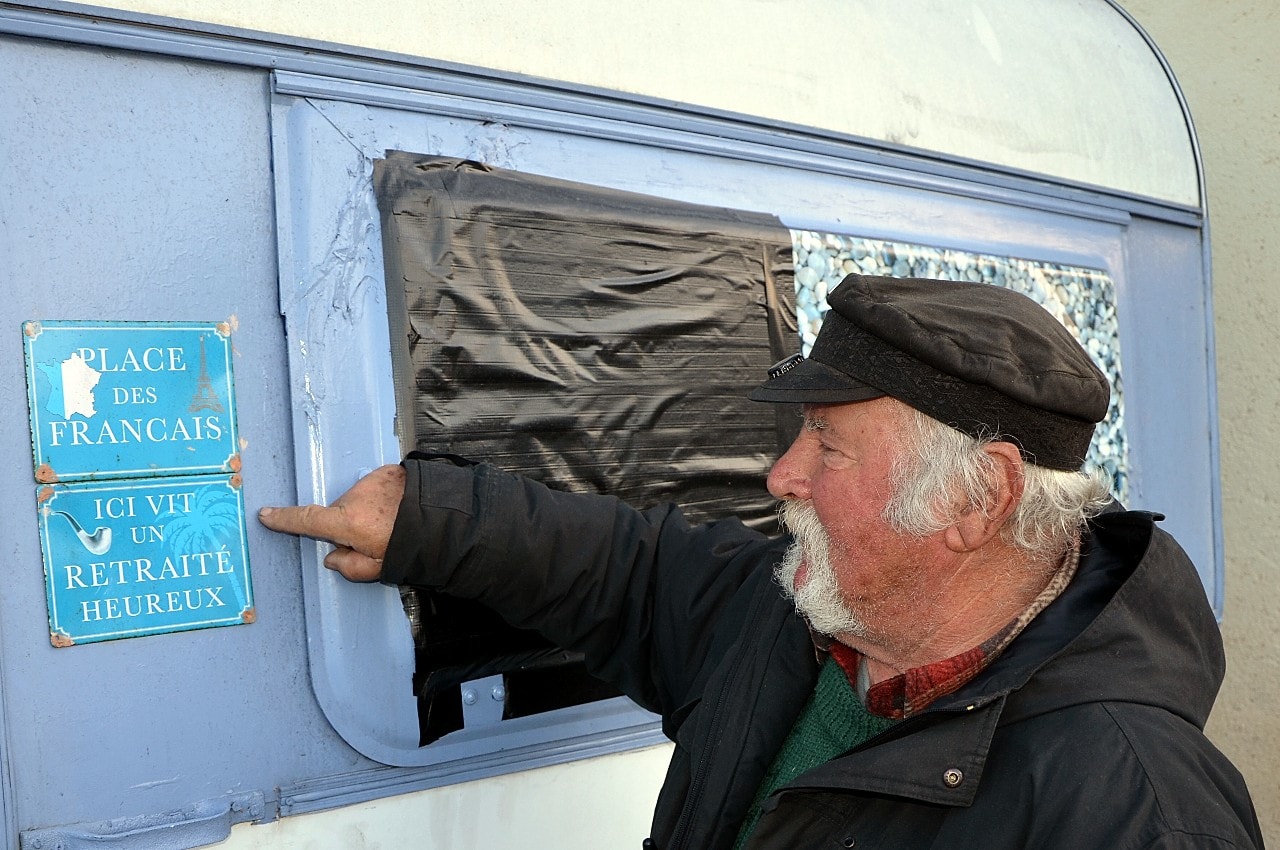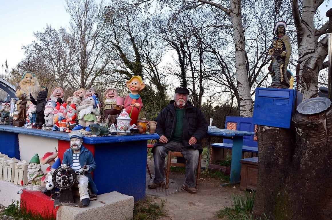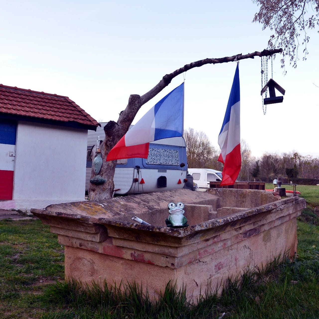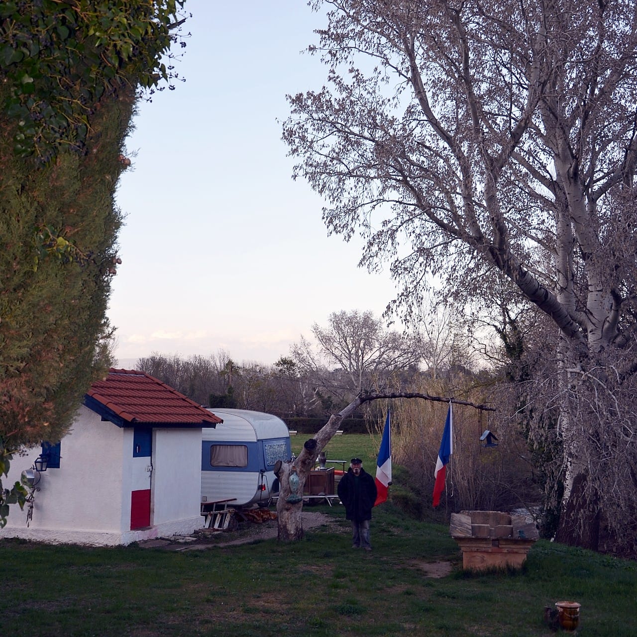 On tourne ou il faut, au pif, à droite, en gardant le Rocher en vue, sur le “Chemin de la Roquette”, on passe un pont… et c’est là, direct à droite, un grand terrain, une ancienne vigne, avec une p’tite maison à laquelle est accrochée une p’tite caravane…On ne peut ni ne sait se tromper, il y a même des nains de jardins exposés sur une table-meuble extérieure…