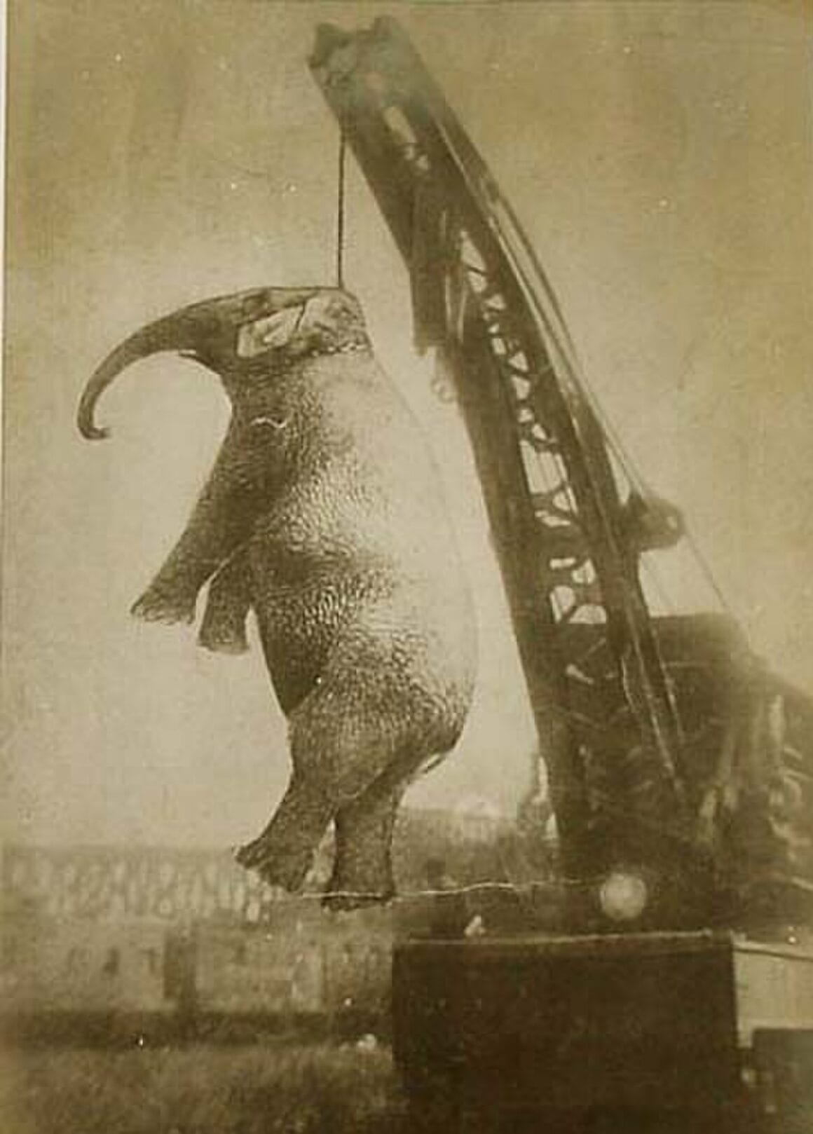 Ils formaient une foule de 3.000 personnes au moment où le spectacle du cirque était terminé. Et ils étaient ravis lorsque “Big Marie la meurtrière”, dut se conduire en tête d’un cortège d’éléphants en une ligne qui se tenait “de trompe à la queue”, jusqu’à la grue qui lui servirait de potence. Ils lui ont serré une patte dans des chaînes et l’ont attachée à un rail. Ils ont sécurisé une lourde chaîne autour de son cou. Ils l’ont soulevée avec la grue, mais ont oublié de relâcher la chaîne autour de sa patte ! Les chaînes s’étiraient et se tendaient autour de son cou, autour de sa patte, sous le regard attentif de sa famille d’éléphants, chancelant d’horreur, bouleversés de la cruauté américaine. Toute l’Afrique, le reste du monde subissent le même destin ! La foule a poussé les bourreaux à continuer : “Laissez-la se balancer, laissez-la se balancer”, ont-ils scandé. Alors que Big Mary était soulevée, ils se turent soudainement, surpris d’entendre les os d’éléphant de Big Mary se tordre et se briser ! Ses ligaments s’étiraient et se rompaient, alors qu’elle était soulevée à un mètre du sol, alors que la chaîne autour de sa cheville l’empêchait de quitter le sol. Ils furent surpris quand la chaîne autour de son cou se brisa soudainement et que le corps de Big Mary heurta le sol avec un craquement audible quasi dans l’entour du monde, poussé par le vent de la honte, un ouragan d’horreurs. Ce craquement qu’on entendait lorsque sa hanche s’écrasa, brisée sous son poids, alors qu’elle gémissait de douleur, était abominable !