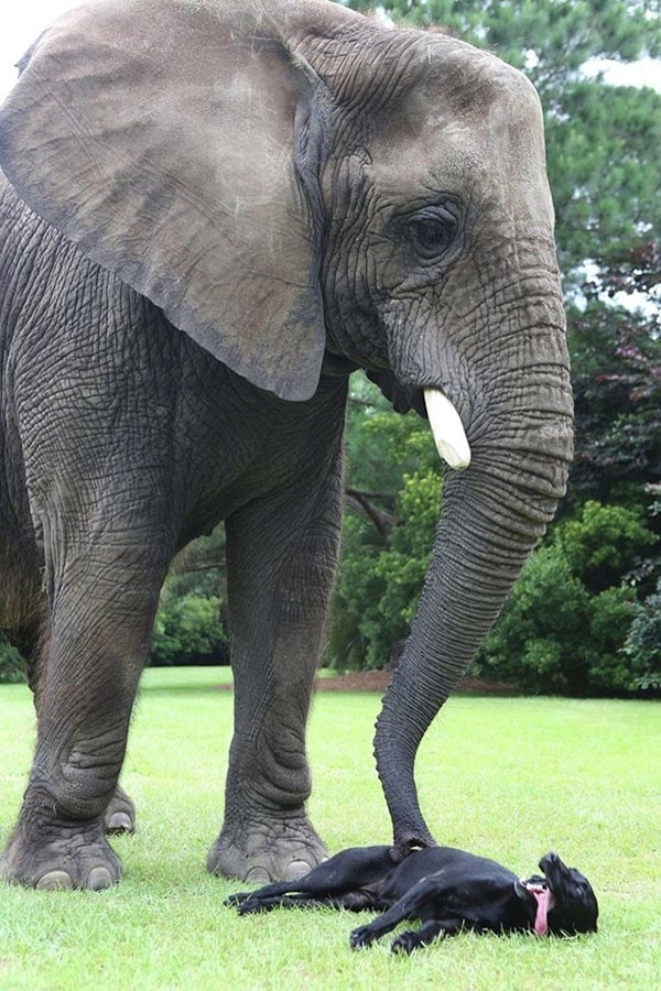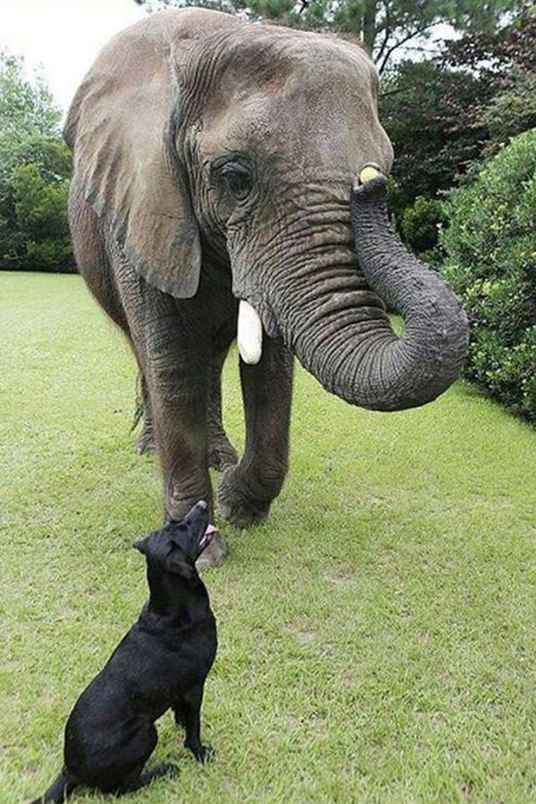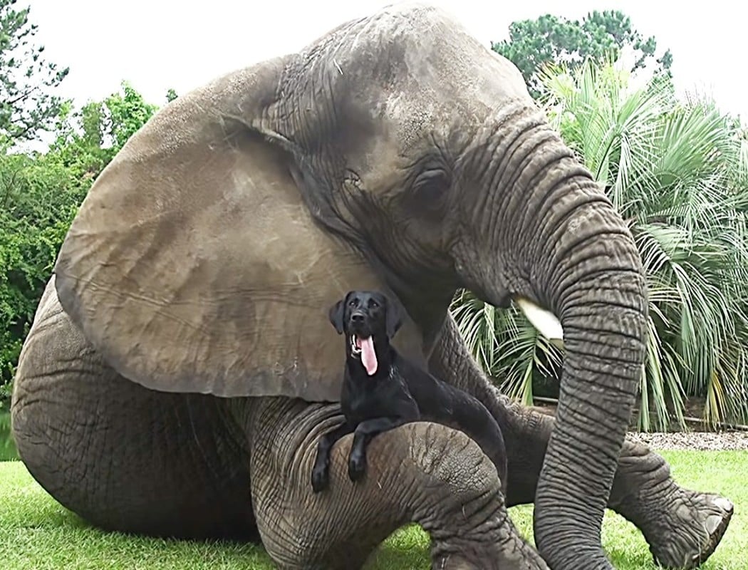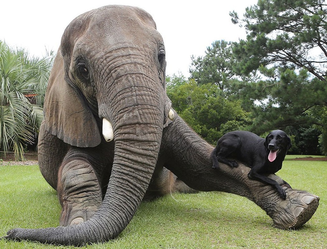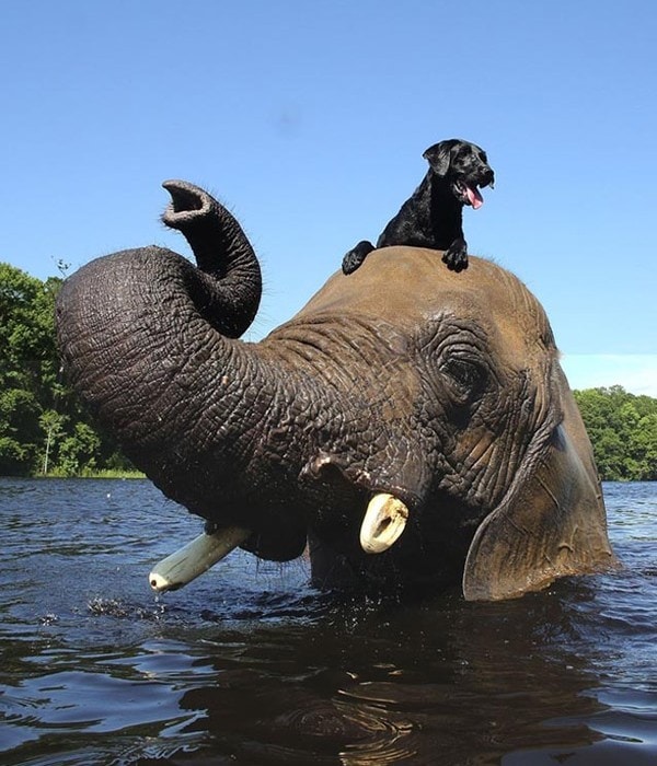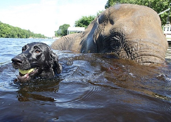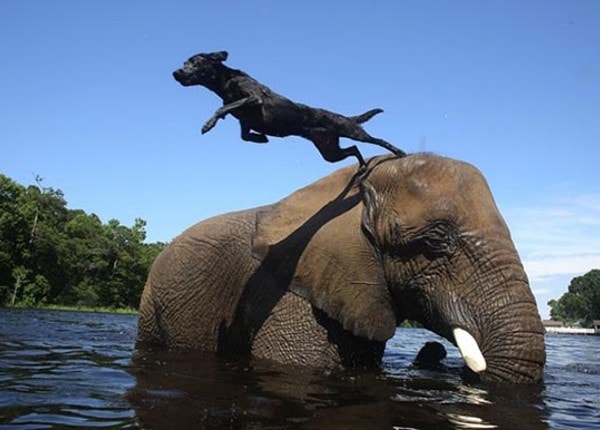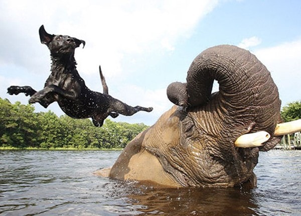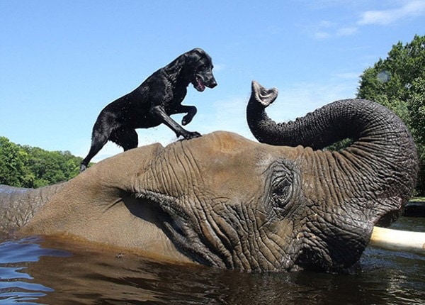 Bella (qui ressemble à mon Cocker Blacky), est également résidente au Safari, et est devenue très proche de Bubbles et les deux sont maintenant les meilleurs amis du monde, ils aiment jouer. Bella se tient sur le dos de Bubbles, elle lance la baballe de Bella dans l’eau avec sa trompe et Bella plonge du dos de Bubbles pour la récupérer… Plouf !