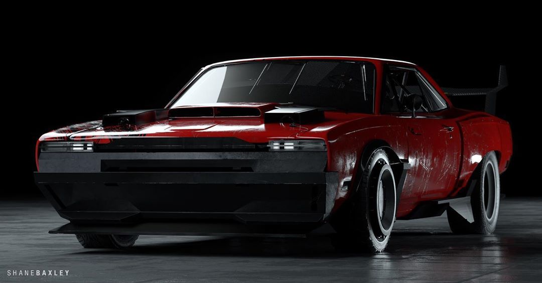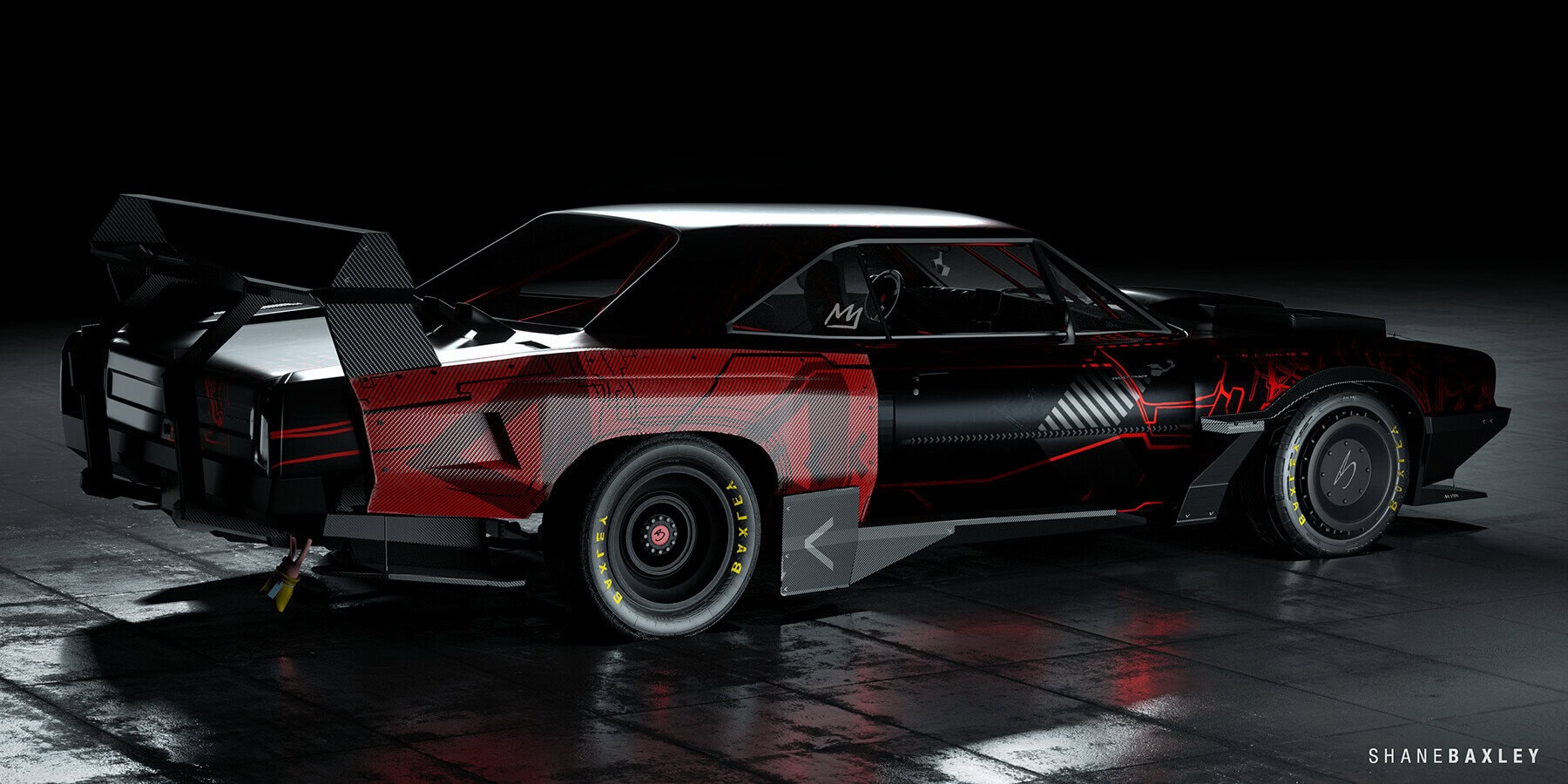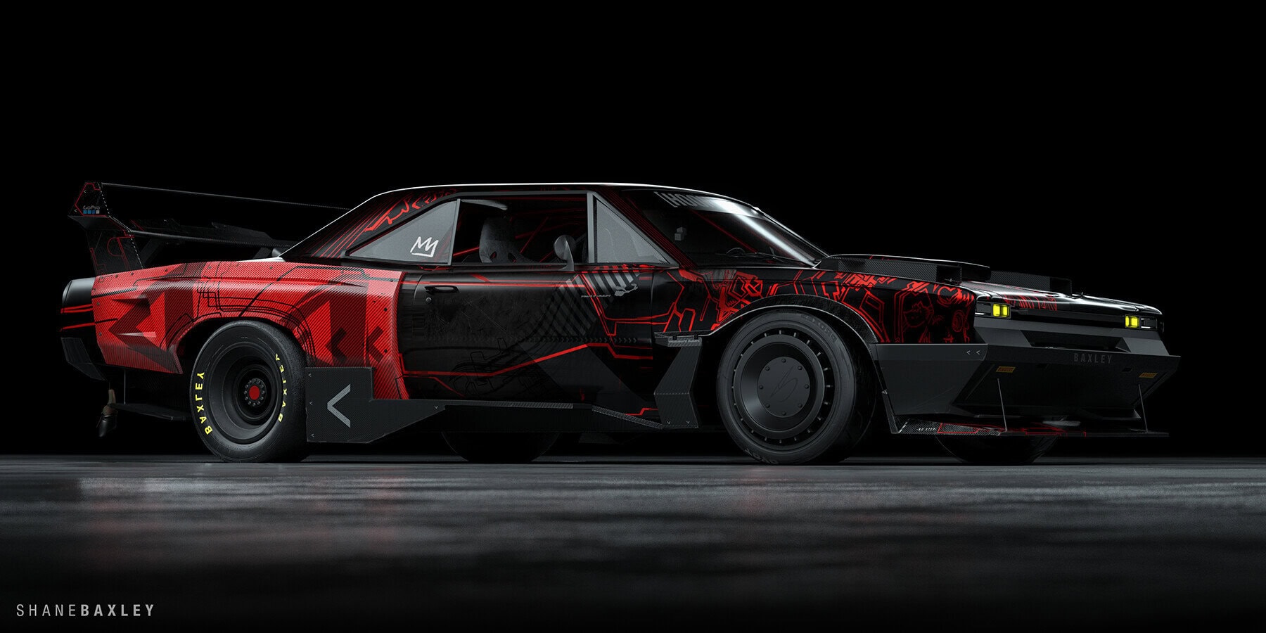 Shane Baxley s’et également approprié virtuellement d’une Plymouth Road Runner 1968 en lui ajoutant des fonctionnalités qui semblent coller à leur ADN initial, en y greffant numériquement des pièces en fibre de carbone pour certains éléments sans devoir s’inquiéter des coûts évidents du matériau.. Ce maître des pixels a réalisé deux versions, cependant, les aspects qui les distinguent sont plutôt subtils, avec des exemples tels que le profil de l’aile ou celui d’éléments complémentaires du capot qui sont là pour s’assurer que les deux turbos assistant le V8 de la Plymouth sont protégés…