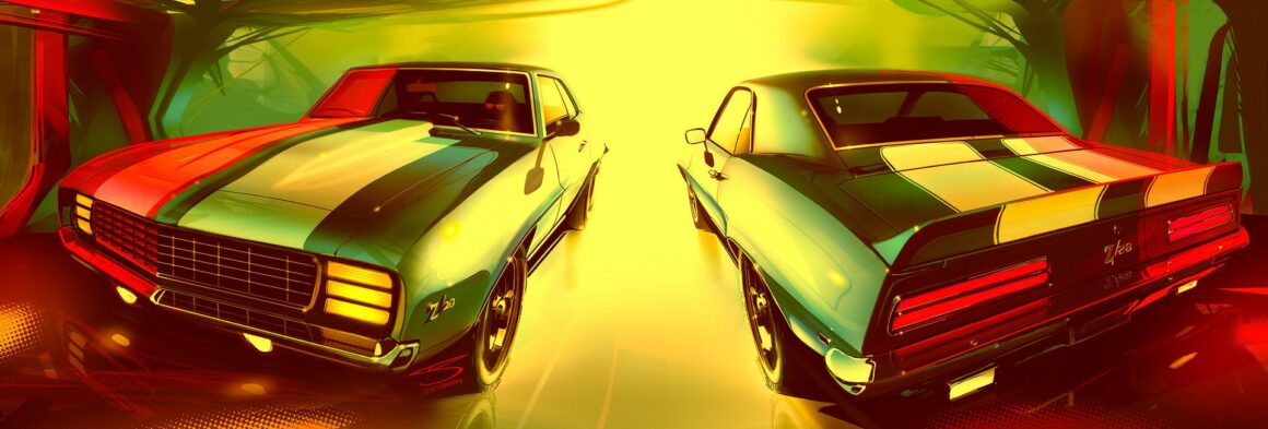 Chaque phare en forme de capsule est également doté de bandes LED sur les bords, renforçant sa forme “spatiale” semblant venir de l’ère Soviétique. Le concept de Baxley suit une tendance courante de voitures classiques “cyberpunk” avec une métamorphose spatio-temporelle. Une Chevrolet Camaro aurait fait l’objet d’une refonte assez éblouissante l’année dernière par le même Baxley et j’ai noté que je devrais en faire une recherche pour un éventuel article (sous réserve, j’ai découvert une illustration et cela me semble suffisant pour justifier de ne pas en faire un article…).