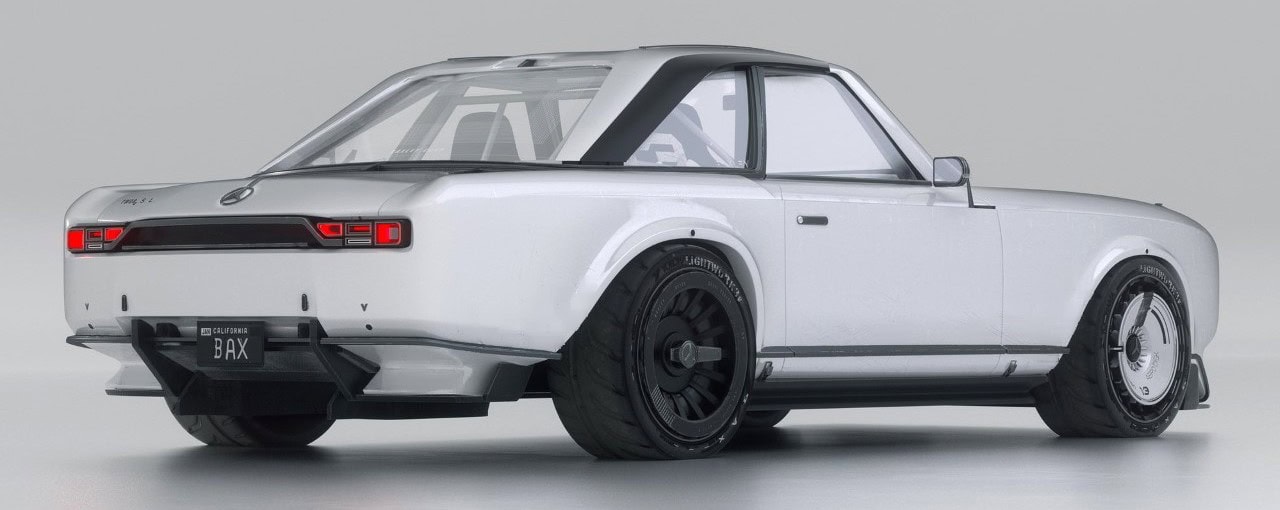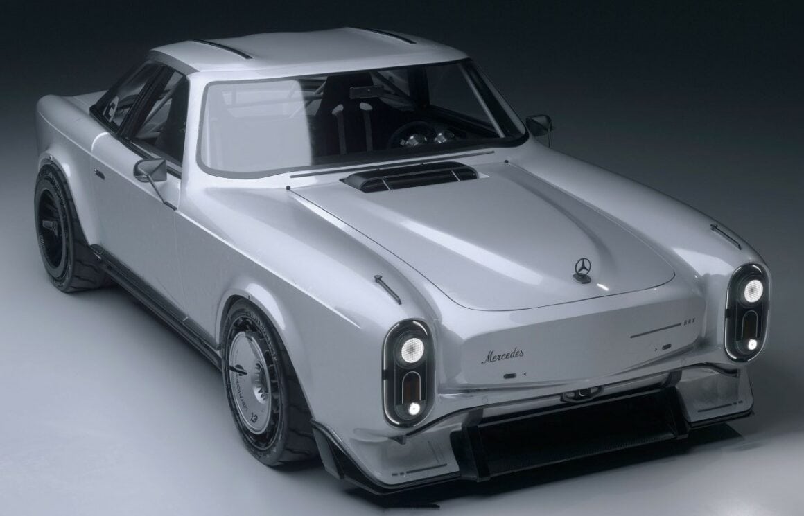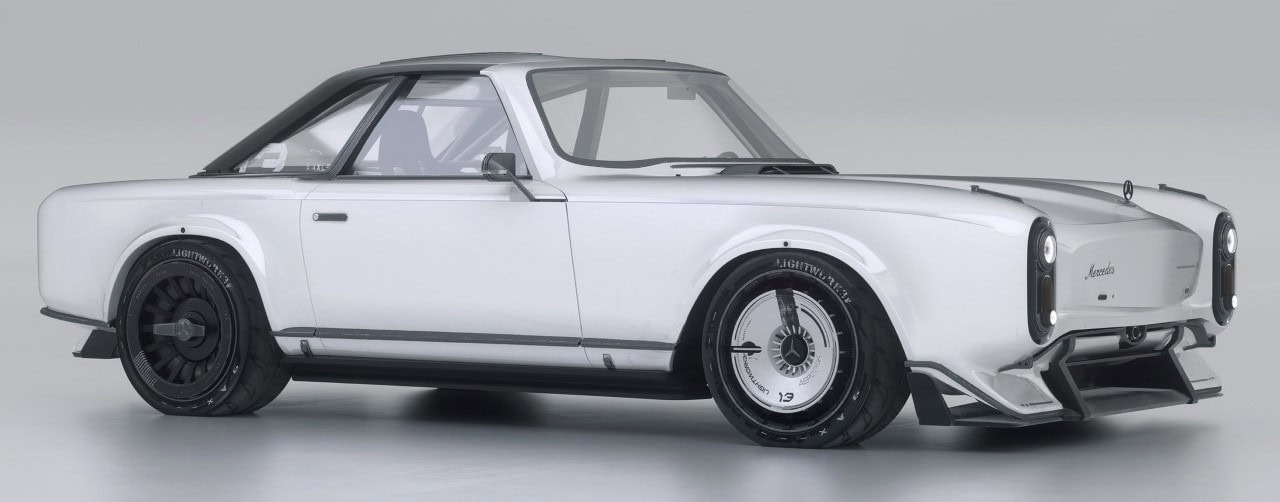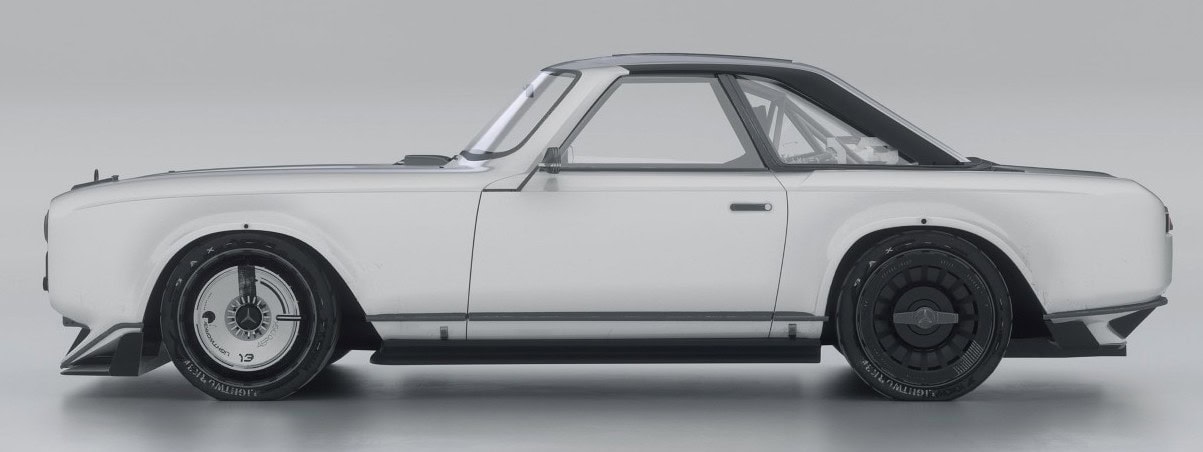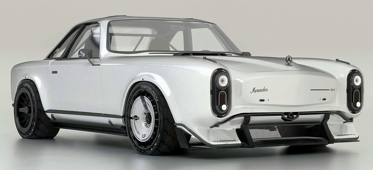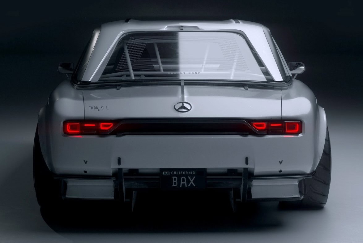 En effet, la plate-forme réalisée à Untertürkheim a été mal calculée par Paul Bracq, ce qui a contraint les concepteurs d’adaptations/machines à élargir les passages de roues… Je n’ai rien d’autre à en raconter… Mais je me dois d’être complet concernant cette version électrifiée… Conçu par l’artiste conceptuel américain Shane Baxley, cette “TWO 80 SL” (prononcez “two-eighty-SL”) est une réinterprétation d’un modernisme dépassé depuis trois quart de siècle, avec une touche prétendue rétrofuturiste et une transmission électrique en dessous…