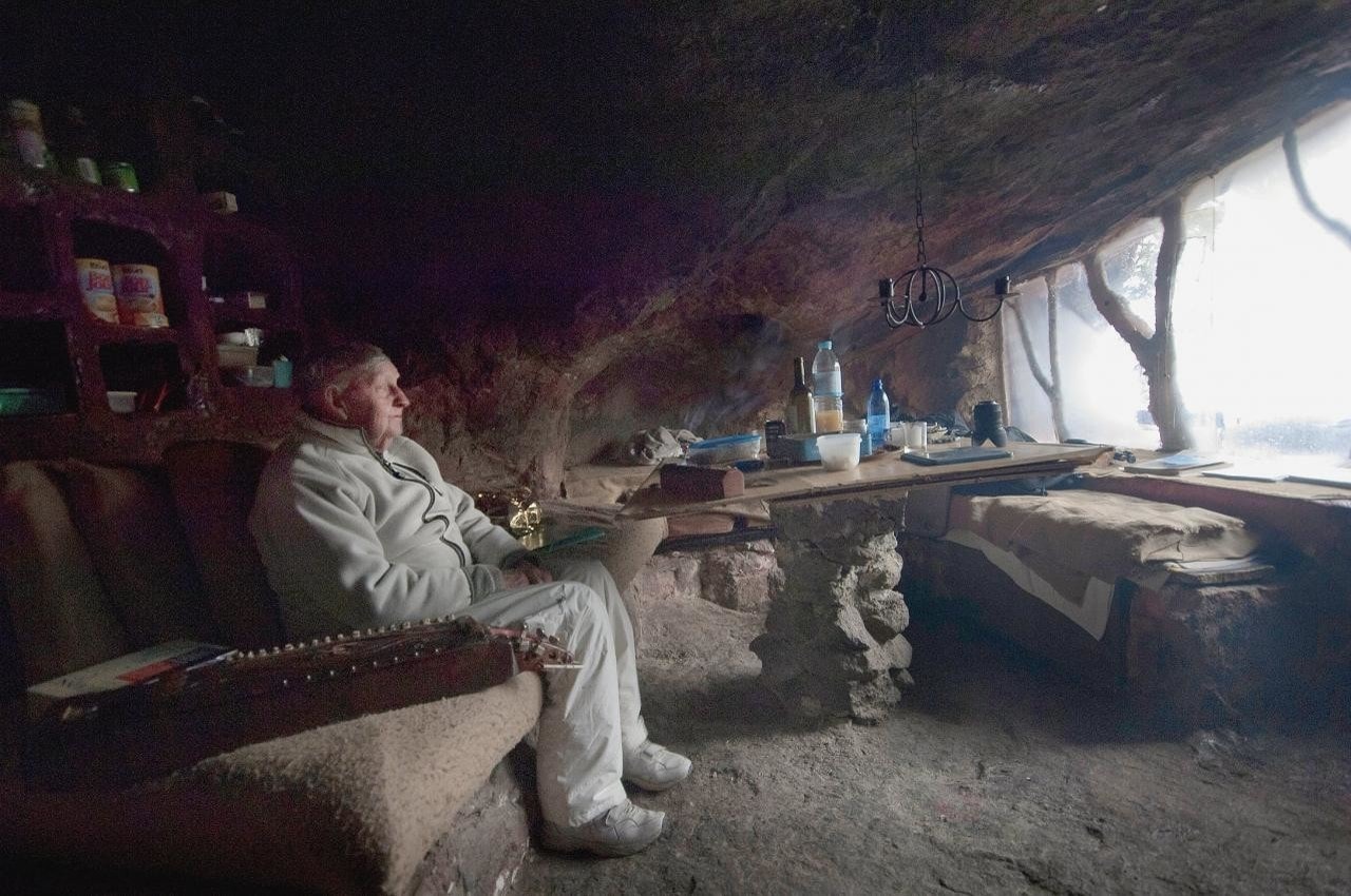 Il vit sans argent, sans compte en banque…, il n’a pas d’eau courante mais récupère l’eau de pluie grâce à deux trous aménagés dans la roche en haut de sa grotte.