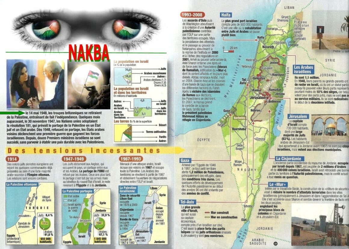 Lisez NAKBA vous serez stupéfait de lire les mémoires d’Harry Truman, président des Etats-Unis-d ‘Amérique qui avait ordonné l’atomisation de deux villes Japonaises, pour en terminer radicalement avec une guerre issue de la réaction du Japon au blocus militaire Américain désireux d’empêcher le Japon de s’approvisionner en matières premières…, Harry Truman a écrit qu’il restait traumatisé d’avoir accepté deux millions de US$ d’après-guerre du Dr Chaim Weizmann, chef de l’Organisation Sioniste Mondiale (puis devenu président de l’Etat d’Israël)…, afin qu’il pousse à ce que les USA acceptent la création de l’Etat d’Israël et forcent les Nations Unies à voter en ce sens… Le territoire visé étant alors illégalement occupé et administré par les troupes britanniques… C’est ainsi que la Palestine a été volée aux Palestiniens et donnée aux Juifs…