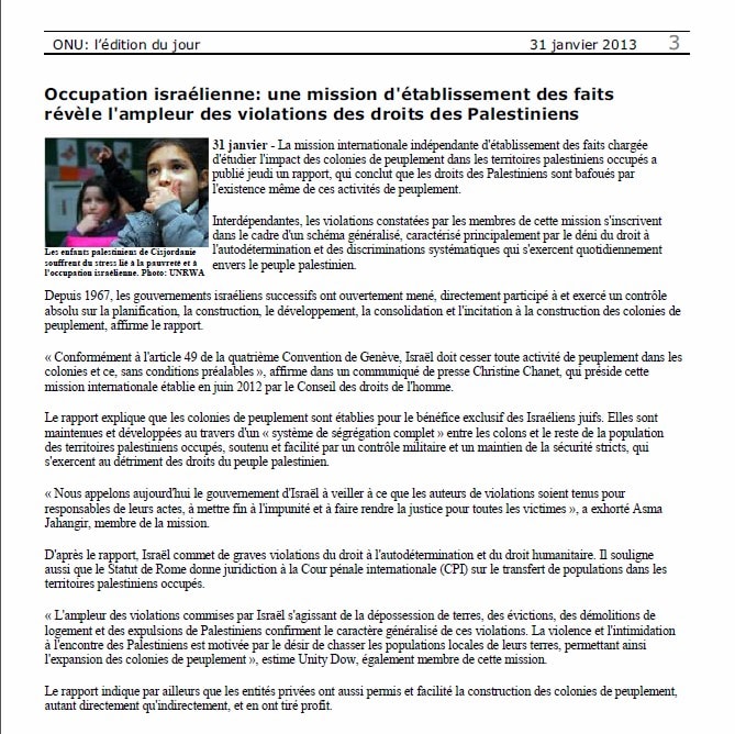 Pour en revenir au dernier rapport de l’ONU qui est la base de cet article, je précise qu’il avait été demandé par le Conseil des droits de l’homme en mars 2012, provoquant la colère du gouvernement Israélien, qui, depuis, ne participe plus aux travaux du Conseil des droits de l’homme… qui discutera de tout ceci le 18 mars 2013, décidant alors des suites à lui donner.