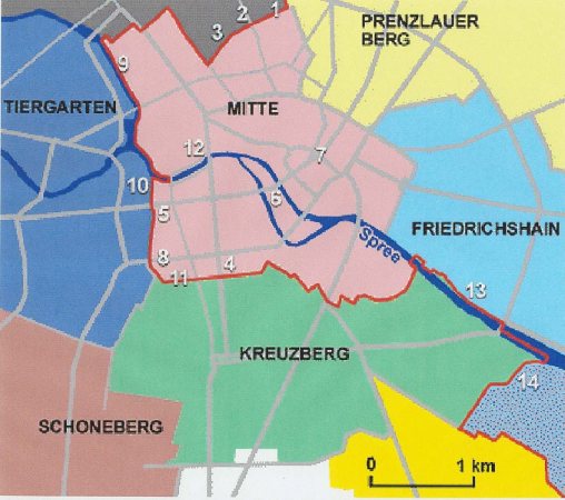 (En rouge, le tracé du mur). Le 9 novembre 1989 fut, c’est sûr, à Berlin “une sacrée soirée” mais le mur ne tomba pas pour autant ce jour-là.