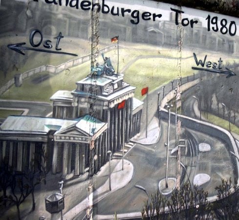 Ci-dessus, la porte de Brandebourg, monument emblématique de Berlin, avant la construction du mur en 1961. Ci-dessous, la même porte telle qu’elle fut dessinée sur un pan du mur en 1980 :