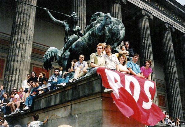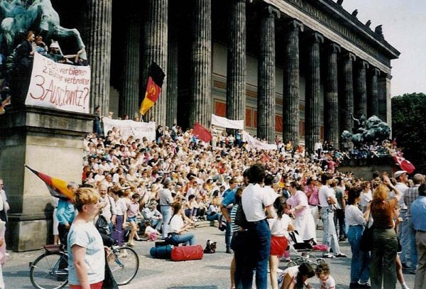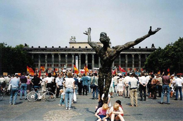 Devant le musée, une grande manifestation de citoyens Est-Allemands brandissaient des drapeaux de la RDA ainsi que des banderoles indiquant leur appartenance au PDS, nouvelle appellation du Parti Communiste est-allemand, autrefois dénommé SED, la seule différence étant qu’on avait, compte tenu des évènements, préféré gommer le mot “communiste” le parti devenant “Social Démocrate”.