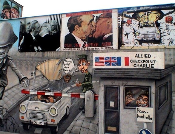 Il sera ensuite complété par un mur de béton, puis muni de divers systèmes de sécurité qui le rendront pratiquement infranchissable. Le mur va donc séparer physiquement la cité en entourant complètement la partie occidentale de Berlin qui va devenir une île au milieu des pays de l’Est car, il ne faut pas l’oublier, Berlin, avec un statut particulier, était situé dans la zone occupée par les Soviétiques, la capitale de la RFA étant alors Bonn. Les réactions occidentales seront ambiguës, Kennedy trouvant la méthode “peu élégante” et Mc Millan ne voyant là rien d’illégal. Toutefois, le 27 octobre, on va en venir à une confrontation directe entre troupes américaines et soviétiques à Checkpoint Charlie, des gardes-frontières de RDA exigeant de contrôler des membres des forces alliées occidentales voulant se rendre en secteur soviétique.