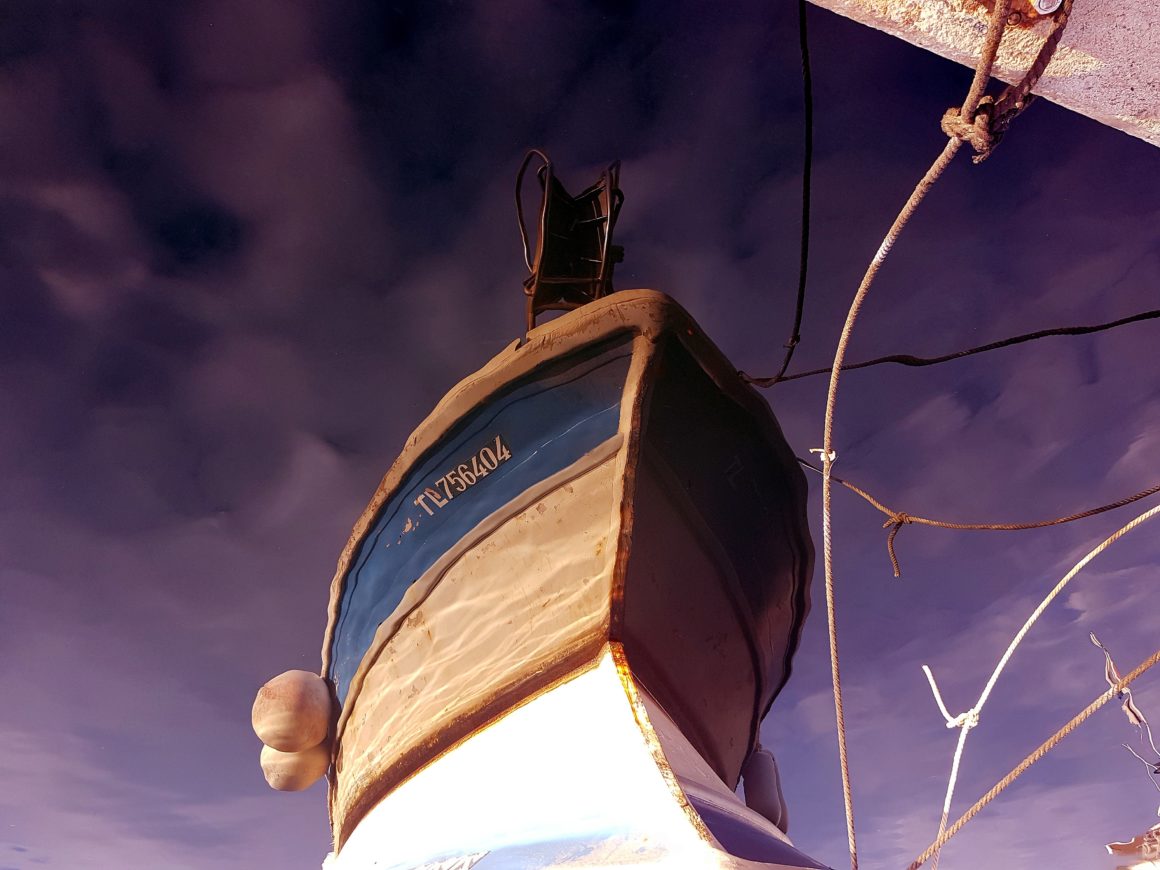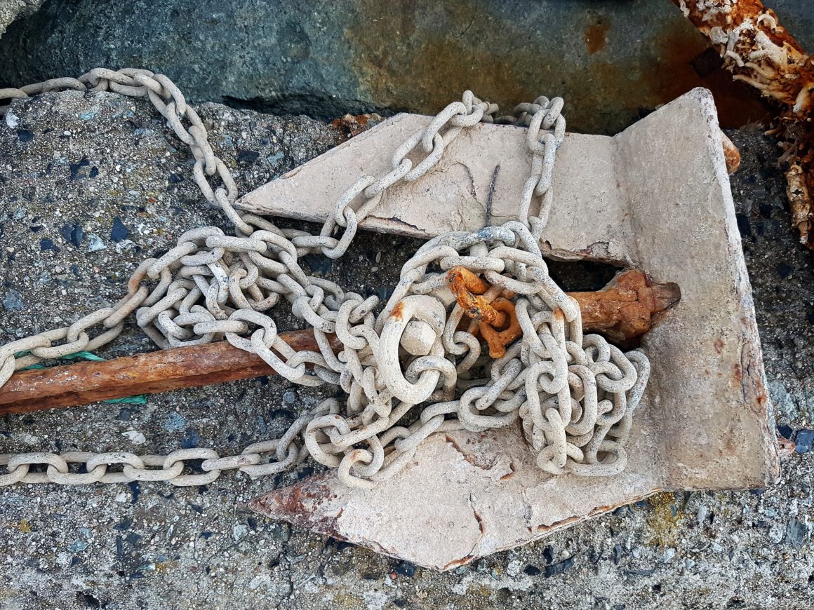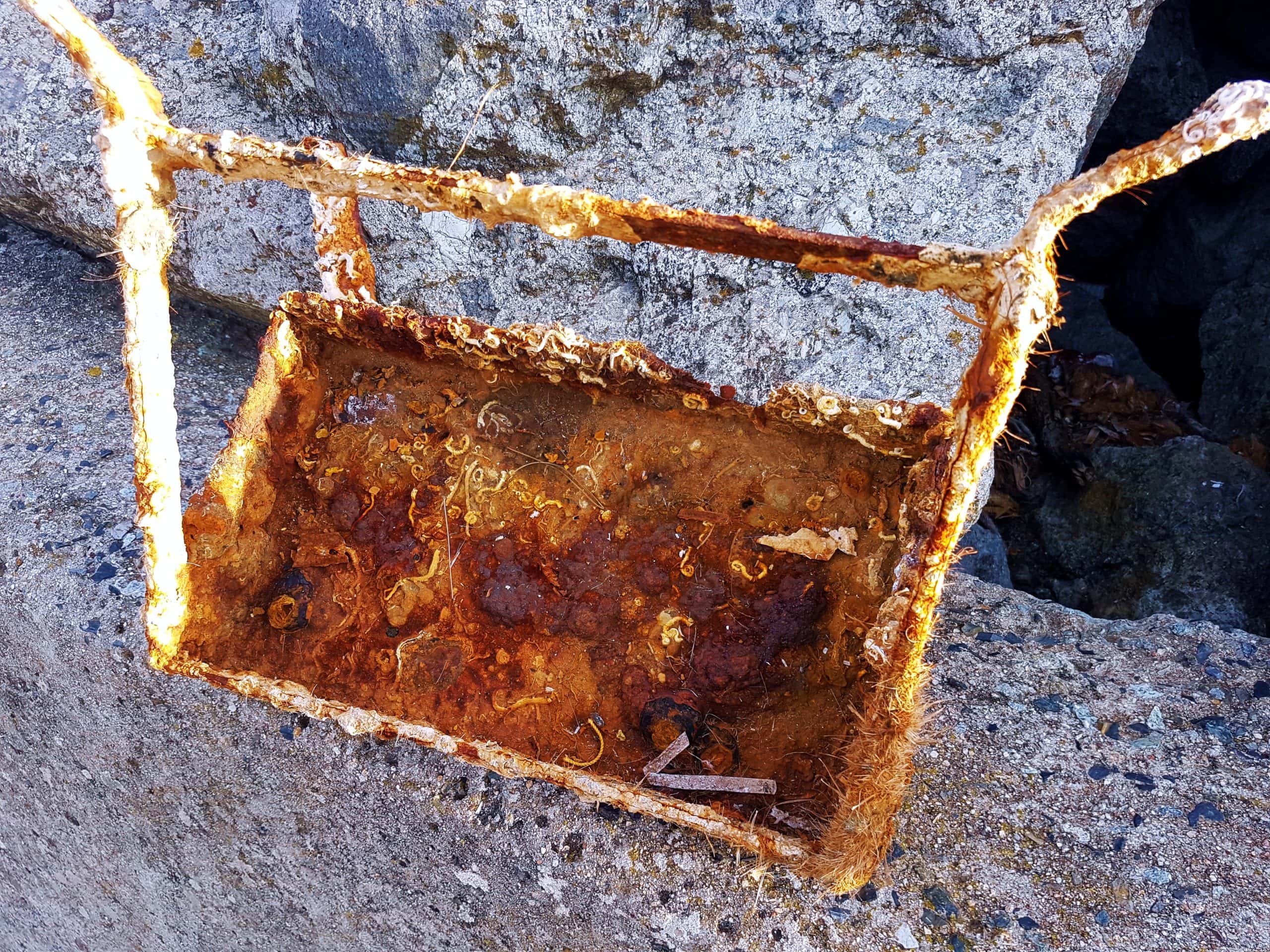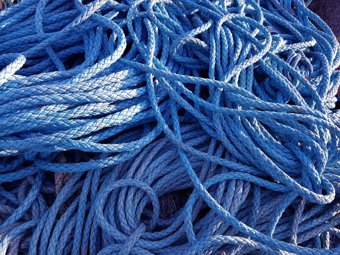 Cordes bleues, filets rouges, vieille ancre… et un “machin” tout rouillé, m’ont inspiré… de possibles donc potentiels beaux objets décoratifs qui, par contre, sentent (ou puent selon la sensibilité) la marée et les poissons morts (crevés)…