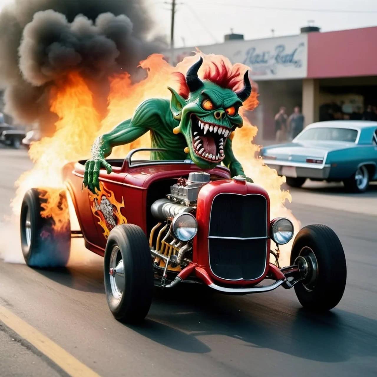 Nous avons exploité l’énergie concentrée de 300 millions d’années et y avons mis le feu. Nous sommes accros aux combustibles fossiles. Mais c’est un pacte de suicide. Nous ignorons les conditions météorologiques anormales et la désintégration de la planète, nous nous retranchons dans nos hallucinations électroniques, prétendant que l’inévitable n’est pas inévitable. Cette vaste dissonance cognitive, alimentée par la culture de masse, fait de nous la population la plus aveuglée de l’histoire de l’humanité. Le prix de cette auto-illusion sera une mort massive. La dévastation en Californie est le signe avant-coureur de l’apocalypse… Le comble est que je publie tout cela alors que j’écris des articles automobiles surtout orientés dans les plus extrêmes des automobiles, à vrai dire, totalement inutiles… Je suis donc aussi fou que ceux et celles pointées dans cet article… Je ne sais que revendiquer mon genre humain prédateur depuis les origines, conscient au point d’en réaliser cet article… Voyez donc, ci-dessous, un p’tit Hot Rod qui brûle…