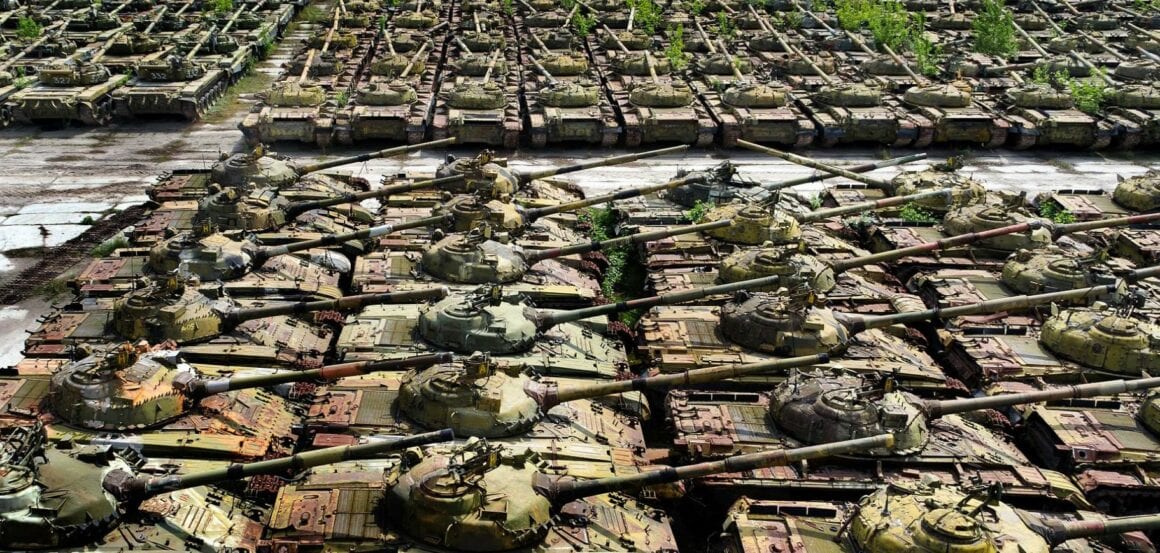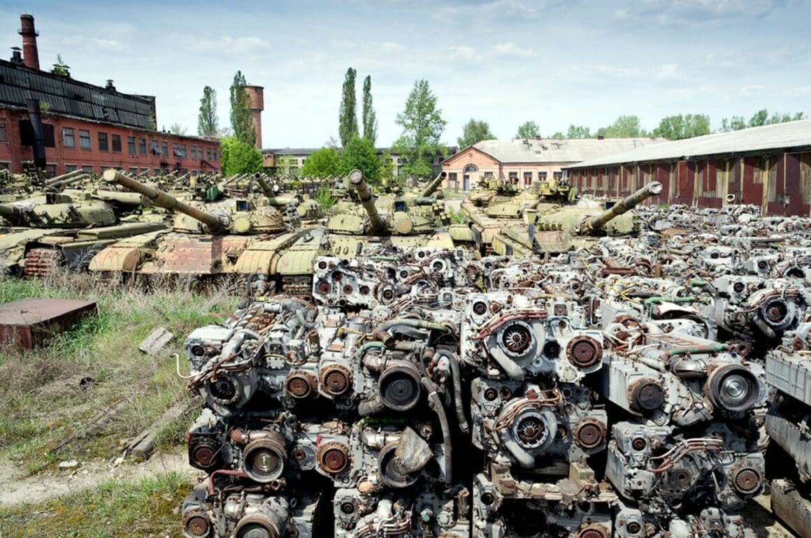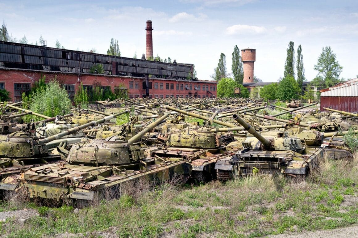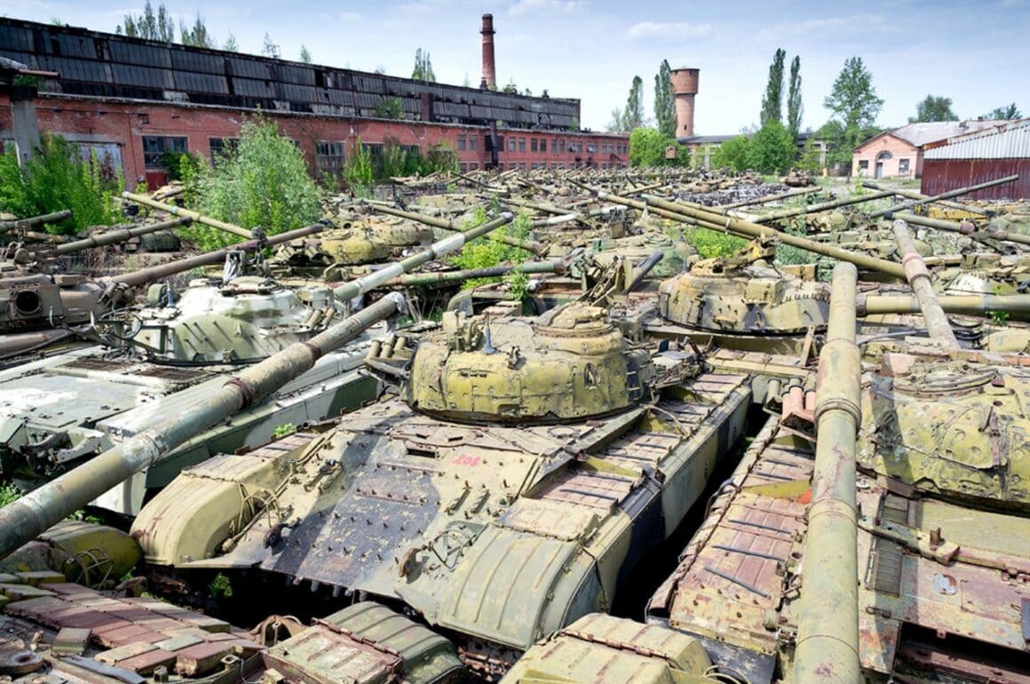 Ces incroyables photographies vous montrent un stock immense, 2.000 tanks et presque autant d’autres tanks en pièces détachées… de quoi faire le bonheur de l’Otan et leur enfoncer bien profond dans leurs culs de faux-culs (un comble car pour trouver l’anus, c’est pas simple). Ces machines de guerre remplissent des hangars et des terrains dans un endroit soi-disant secret situé dans la ville de Kharkov, dans la région de Slobozhanshchyna d’Ukraine orientale, à seulement 20 kilomètres de la frontière avec la Russie.