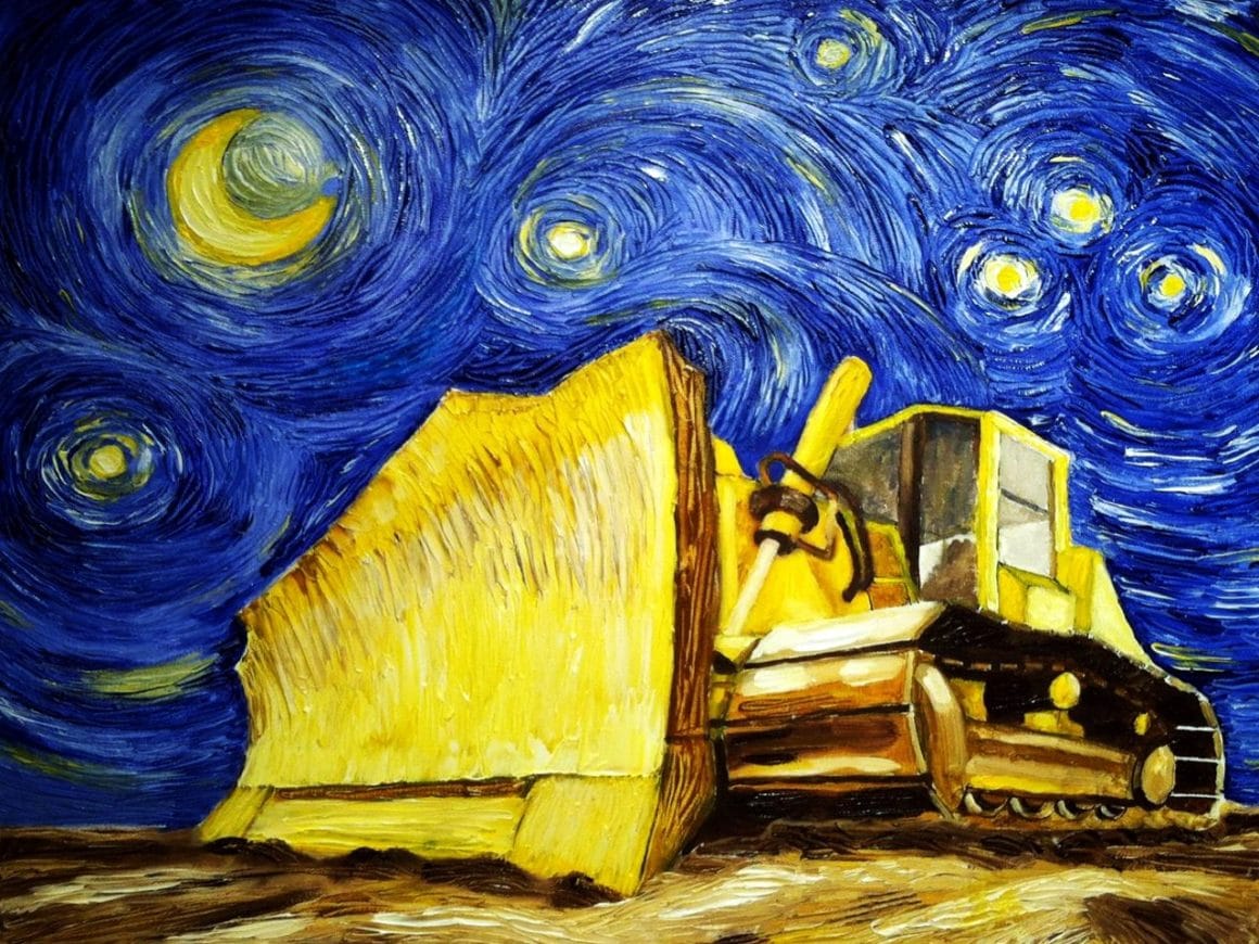 Il n’avait pas le moindre doute, sur l’authenticité de son tableau qu’on lui disait avoir reposé au Moma à New York. Un artiste créateur en est l’auteur. Il a substitué son âme à celle de van Gogh pour illuminer la toile de son inspiration en y plaçant un Boeing ! Cette toile ne faisait donc pas partie du catalogue officiel du peintre et ne valait pas un clou sur le marché de l’art., quoique…. Peut-on imaginer que des experts passeraient de leur temps à analyser la technique et le style, découvrant pendant leurs investigations, qu’à leur grande surprise, un autre tableau (un portrait d’Enzo Ferrari) existait… Ainsi qu’un troisième illustrant une Ferrari 250GTO passant sur un pont… et au comble, un buldozer peint par VanGogh… Pourrait-on croire en une technique divinatoire qu’utilisait souvent Vincent Van Gogh en plus de réutiliser ses toiles, pour ainsi parvenir à faire quelques petites économies, lui qui n’avait pas un sous pour se nourrir….