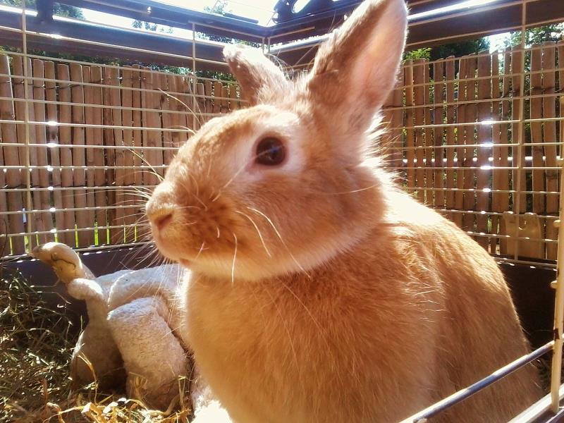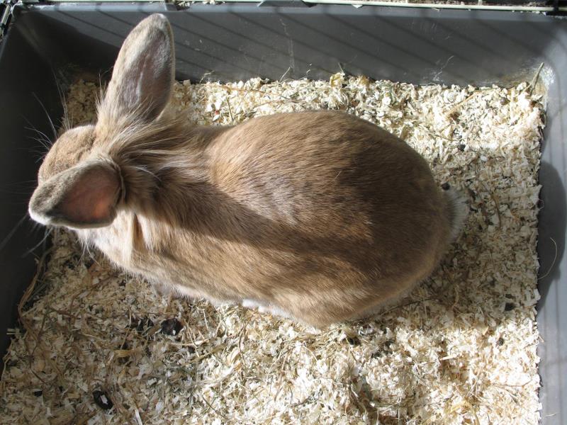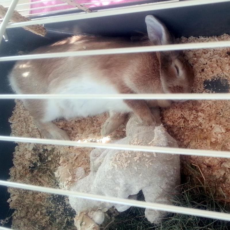 Pour un rien, voulu ou pas, la lapine tournait autour de toi en tapant de ses pattes arrières, elle tirait sur son biberon d’eau avec ses dents pour la rappeler à elle… et mangeait avec gourmandise ses graines (mais ce qu’elle préférait c’étaient les pommes)…, puis elle s’allongeait de tout son flanc et parfois sur son dos, là seulement, on pouvait voir son beau ventre blanc tant elle se sentait en sécurité, sans prédateurs, profitant de sa paille fraîche et son foin des Alpes au goût de fleurs…