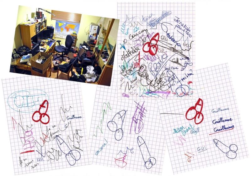 Sitôt dit, sitôt fait, sauf que la cage de la lapine a rapetissé la chambre…, il fallait choisir entre accéder aux armoires, à la porte-fenêtre de terrasse, ou au bureau qui, dit en passant, ne servait qu’a supporter des piles de livres, feuilles et autres choses parfois intimes (des préservatifs usagés, sic !)… une télé surplombait même ce meuble absolument pas dédié aux études…, car fiston étudiait en slip, vautré dans son lit en tapotant frénétiquement des SMS sur son GSM tout en regardant/enregistrant des vidéos sur son ordi-portable, qui finira par rendre l’Âme (surchargée), simultanément il jouait à des jeux étranges sur une console entre deux branlettes en attente de “baiser” sa copine à corps et à cris (beaucoup de cris)…