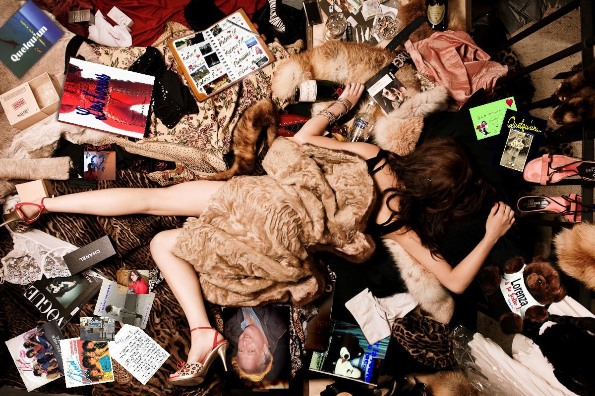 Bagages et paquets, Gypsie, notre petite Cocker sous le bras… et mots méchants jetés par-dessus l’épaule : c’est ma dernière image de toi…, voilà du songe et des attentes inscrites dans plus exactement affermi que le marbre…, un modèle troué…, une Diane au nez cassé (toi)… et un Mercure affublé de son trident d’éponge ne pouvant pas pleurer la mer (moi)…, les yeux barrés des orbites et des violons à cordes fausses.