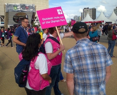 8h03… La journée commence mal : un nain volontaire me hurle dans les oreilles avec son mégaphone, le chemin à suivre pour le parc olympique…