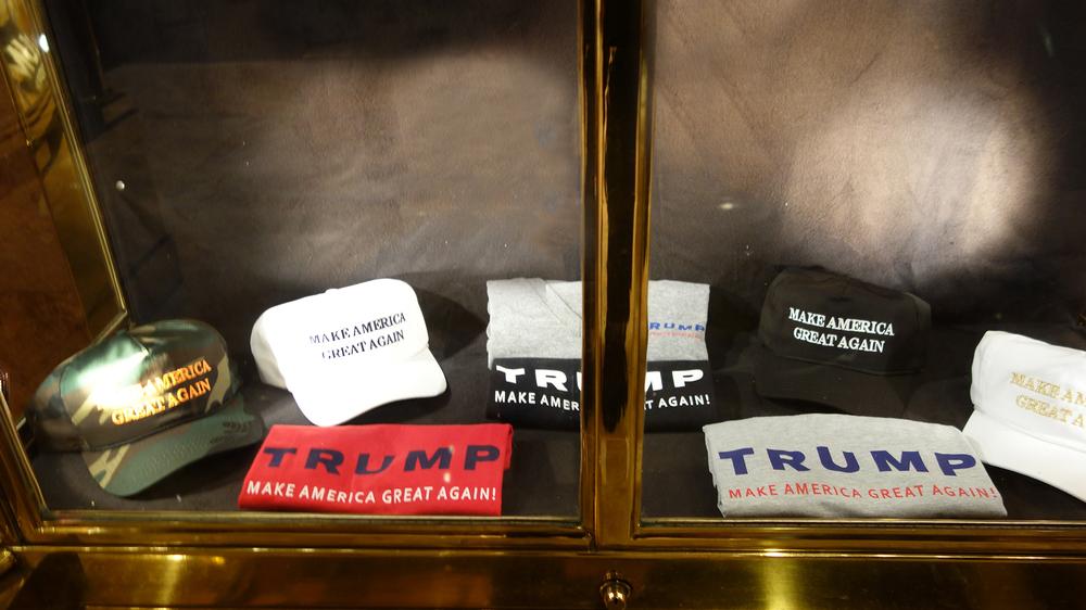 Dans le hall, on peut acheter d’innombrables articles à la gloire du 45ième président des USA, milliardaire, magnat de l’immobilier, vedette TV… et j’en passe : boutons de manchette, cravates et pinces à cravate, tenues de soirée, trench-coats, casquettes de golf, couvre-clubs, vêtements pour bébé (sans rire) et livres pour apprendre à réussir à la manière de Trump (j’ai été tenté)…
