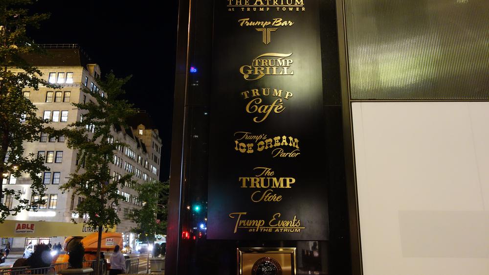 La “Trump Tower” est faite de marbre et de laiton…, les indications sont en lettres cursives et les rideaux en velours rouge…, il y a des vigiles en costard à l’entrée…, il est 19 heures et il faut dire que le lobby est manifestement vide, tout comme le “Trump’s Ice-Cream Parlor” (où un garde sécuritaire est plongé sur son smartphone), le “Trump Grill”, le “Trump Store” et le “Trump Café”….