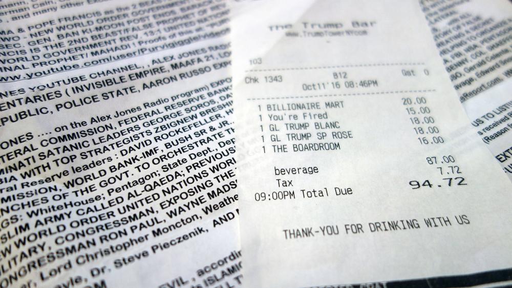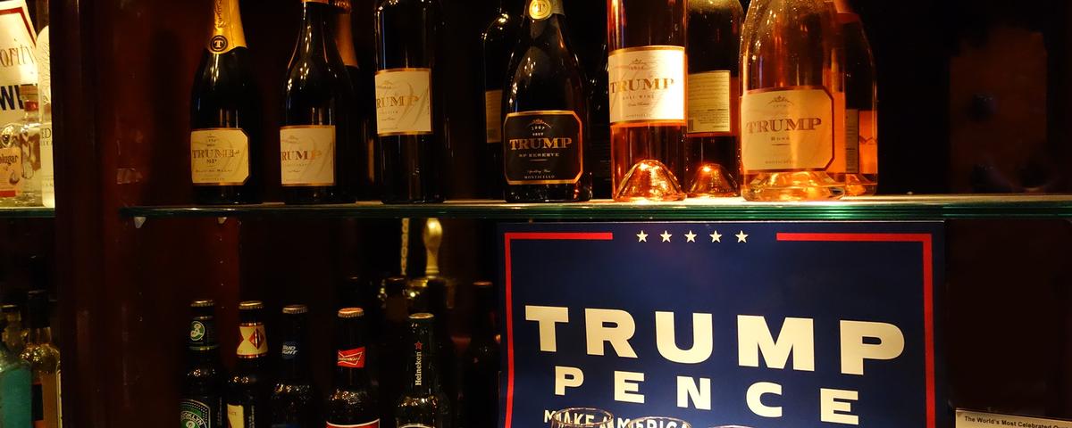 J’ai fini le martini et j’ai mal à la tête…, derrière le bar, un comptoir porte différentes bouteilles de vin Trump…, je commande un verre de “Trump rosé pétillant” à 18 dollars.