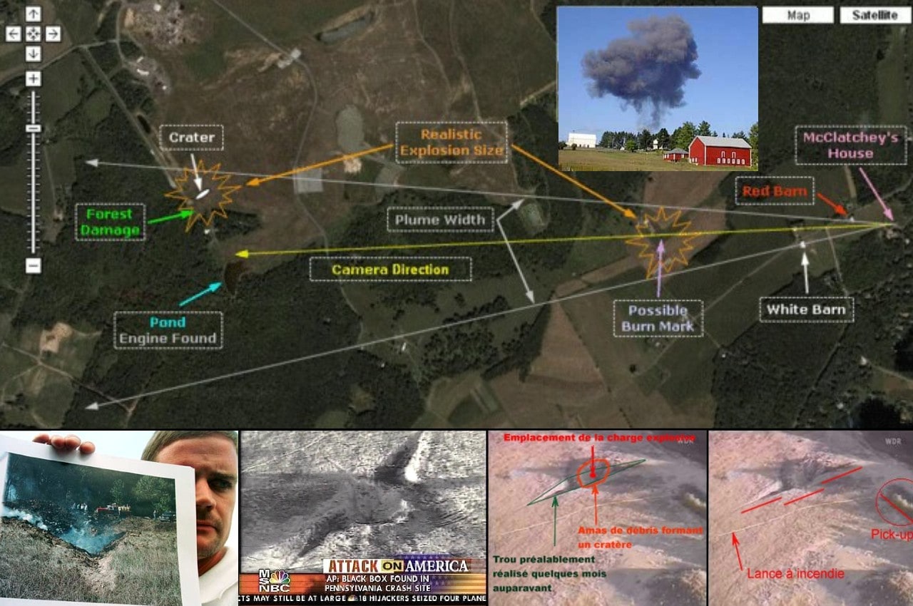 -d’un Boeing 757 qui disparait totalement (comme s’il n’avait jamais existé) dans une excavation pré-creusée de 300 m³ située dans un terrain vague de Shanksville en Pennsylvanie dans laquelle curieusement les pompiers locaux verseront du mazout de chauffage et y mettront le feu…