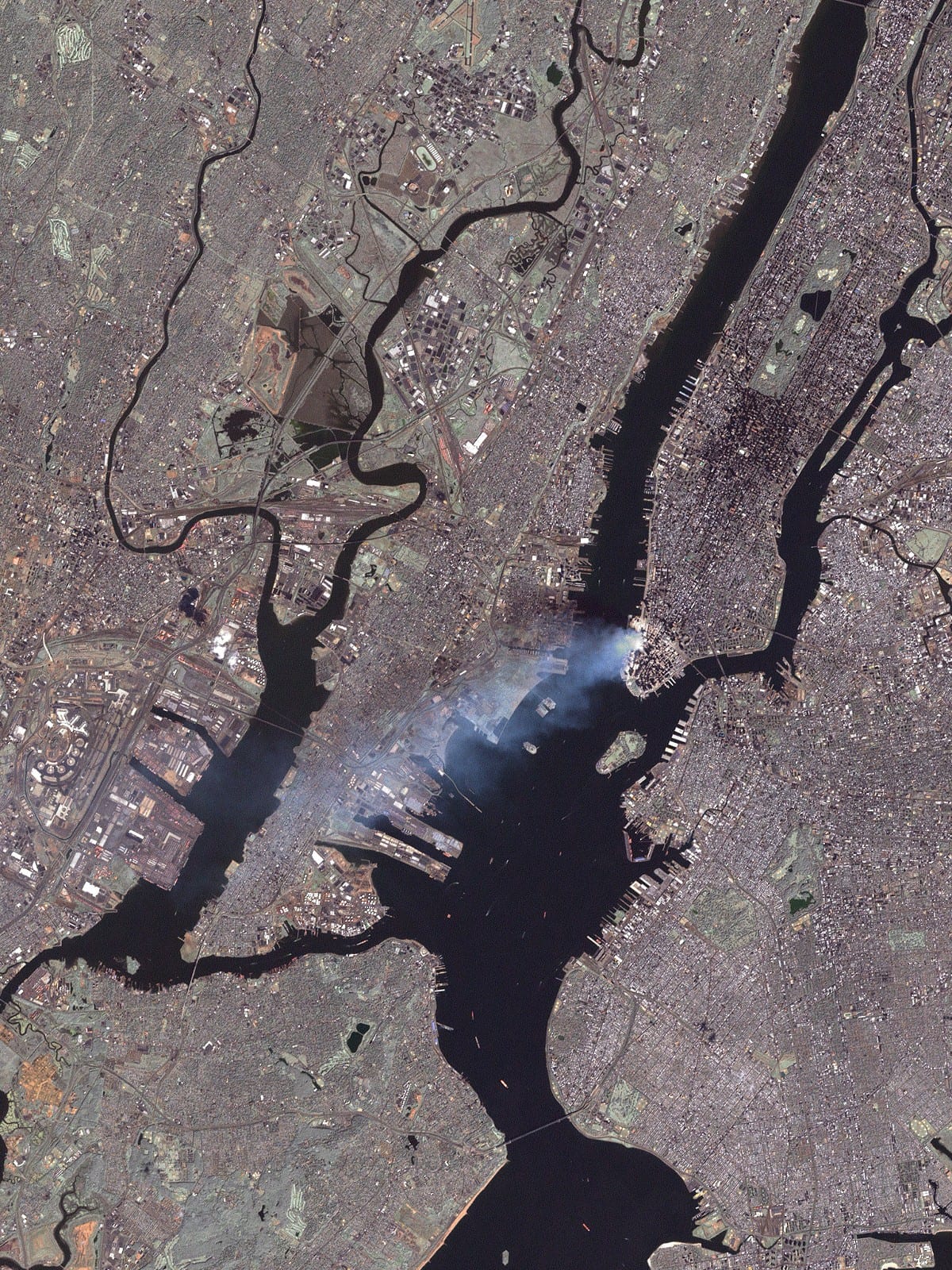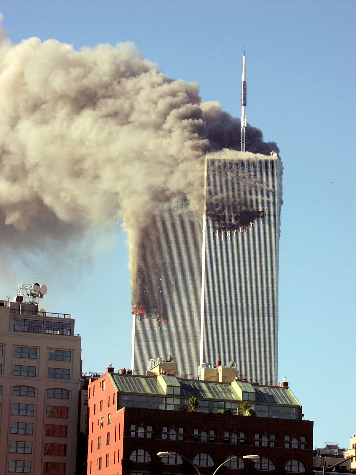 -2 Boeing 767 chacun dans une des tours-immeubles du WTC de New York, qui y disparaissent en ne laissant aucune trace sauf le passeport intact de Mohamed Atta dans une farde en plastique (Une troisième tour s’effondre toute seule en solidarité alors qu’elle n’a pas été percutée par aucun avion où des débris, mais plusieurs milliards de dollars et des documents “Secrets d’Etats” parviennent à s’en échapper, qui ne seront jamais retrouvés)…
