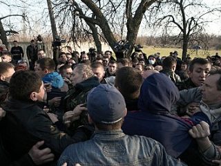 Des dizaines de locaux veillent aux abords…, Maksim R. arrive de Donetsk, où il participait à l’occupation de l’administration régionale…, il pensait se reposer ce week-end à la maison, mais un front s’ouvre…, il vient aider…, entre ses doigts, il tient un thé chaud, préparé par des volontaires.