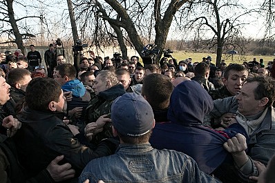 Les deux voies d’accès sont des ponts bien gardés par des habitants locaux, non armés en majorité…, la circulation est coupée…, au nord, on a abattu des arbres pour barrer la route à d’éventuels véhicules blindés…, au sud, un barrage de pneus a été dressé…, il faut passer, à pied, devant quelques vieilles récitant des prières face à une icône, puis un atelier de confection de cocktails Molotov sous une tente.
