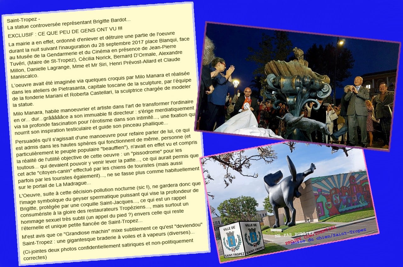 Le “but” de la statue, qui DEVAIT trôner en plein centre de St-Tropez comme une enseigne publicitaire gratuite et “à-vie” (ce ne sont pas les Tropéziens qui payent, mais ce sont eux qui subissent, c’est Alexandre Millon qui l’offre, le duo Millon/Manara est donc certain qu’elle sera bien fixée en un endroit de passage), est de faire croire “en profondeur” que Milo Manara est un artiste du même niveau que les protégés des milliardaires (ceux-ci habitent presque tous à Saint-Tropez et sont férus de ventes aux enchères)… et simultanément de parfaire une fausse légitimité sur le dos de Brigitte Bardot qui s’est retrouvée “à son corps défendant”, pis que violée… et ce dans une situation ambiguë (a-t-elle oui ou non signée de sa fleur les 25 dessins, était-ce gratuit ?, payant ?)… se rendant tardivement et vraisemblablement compte d’avoir été dupée dans une affaire consuméristo-publicitaire (la statue-hommage) dans laquelle elle ne reçoit strictement rien d’autre qu’une image dévalorisante la représentant nue dans une coquille St-Jacques (quel gag !) posée sur un pieu phallique de très mauvais goût)…, un ensemble que, outré, j’ai caricaturé satiriquement avec le montage d’un “chien qui pisse sur l’Œuvre grandiose”, assorti d’un commentaire humoristique !