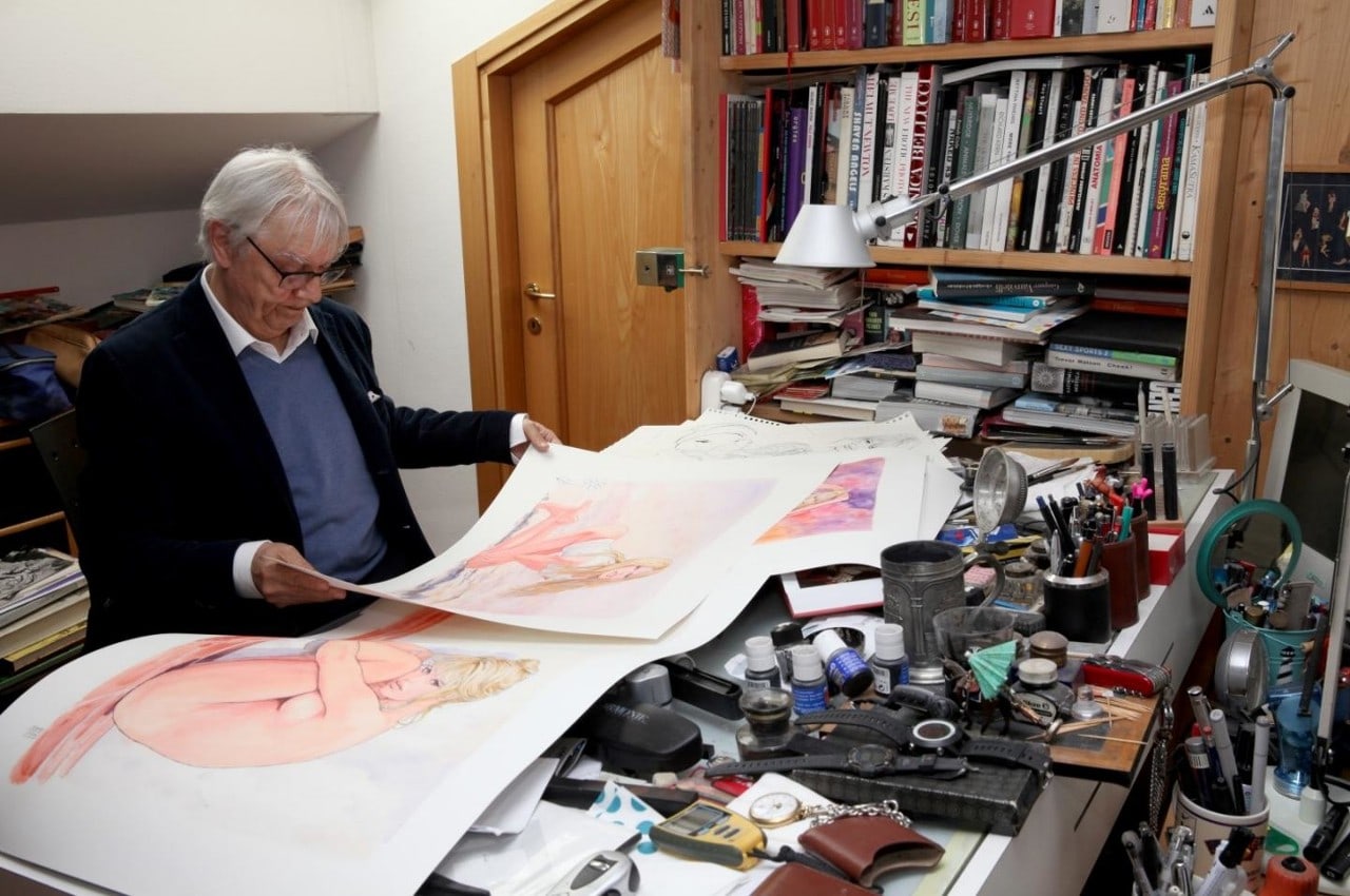 Tout débute par un script comme pour un roman ou un film…, “on” va écrire de manière “docte” et “pompier” (le faux chic), qu’il s’est trouvé avec Brigitte Bardot (sa nouvelle muse), en harmonie avec son imaginaire…. et que de cette rencontre (virtuelle) entre “l’artiste” et “l’actrice phare du cinéma français”, est née une série de 25 aquarelles qui a fait “le buzz” en juin dernier, lors “d’une spectaculaire mise aux enchères” organisée par le commissaire priseur parisien, Alexandre Millon (il aurait du s’appeler “Million”)…, une “vente record qui a tutoyé les sommets pour atteindre un total de 600.000 euros” (Une moyenne de 24.000 euros par dessin qui lui demande environ 5 heures de coloriage et qui semble être réalisé par rétroprojection d’une photo issue du web, c’est “un beau coût” et “un beau coup”).