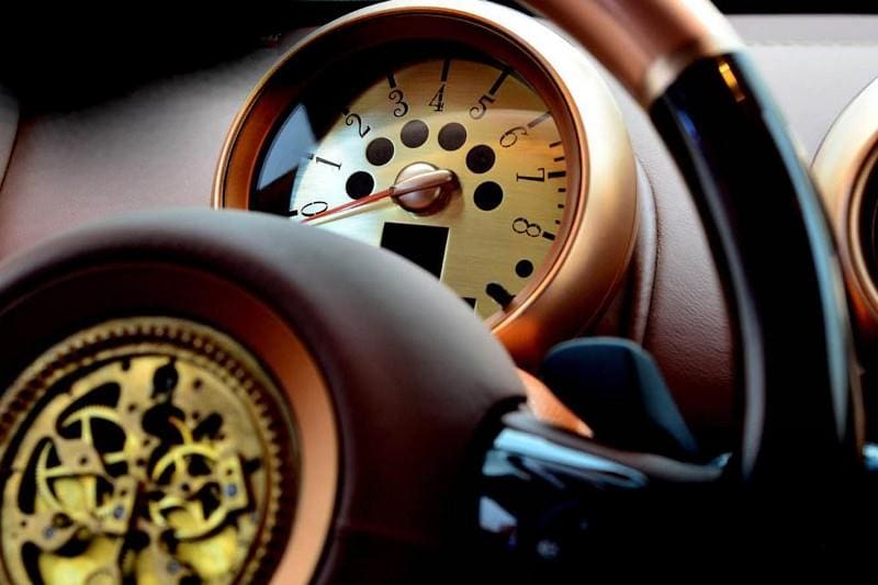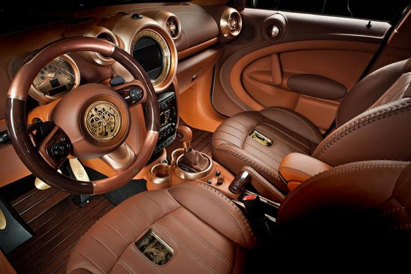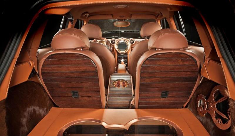 Si la partie extérieure de la Mini-Maxi n’évolue pas vraiment avec une simple peinture et un kit carrosserie, l’habitacle est une véritable réussite et démontre le niveau obsessif avec lequel les artisans de Cartex Design se sont attelés à la tâche…, du cuir marron, aux engrenages intégrés jusque dans l’assise des sièges, en passant par les planchers en bois, le résultat est très impressionnant et respecte à la lettre les codes de ce milieu étonnant…, la voiture ne détonnerait pas dans le troisième épisode de Retour vers le Futur…, pas étonnant d’être baba lorsque l’on apprend qu’il a fallu 9 mois de travail à Carlex Design pour faire cette transformation.