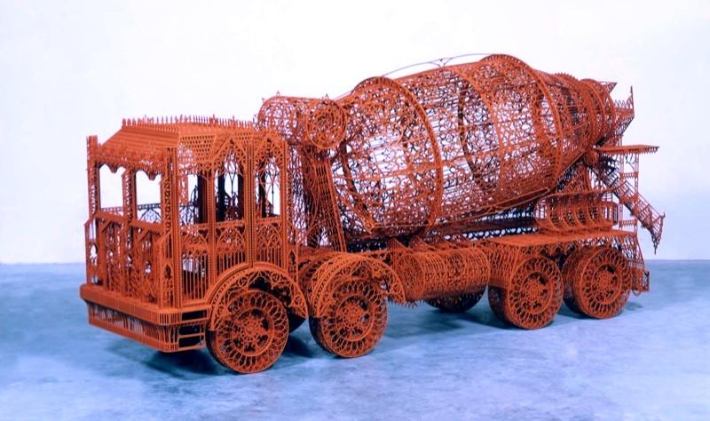 Au rez-de-chaussée, entre deux caisses en partance pour Jericho Road, des pneus sculptés de dentelles gothiques, une bétonnière cathédrale et des vitraux dédiés aux nouveaux dieux du foot, ou un Christ s’entortille dans une croix de bronze comme s’il avait mordu à la tentation.