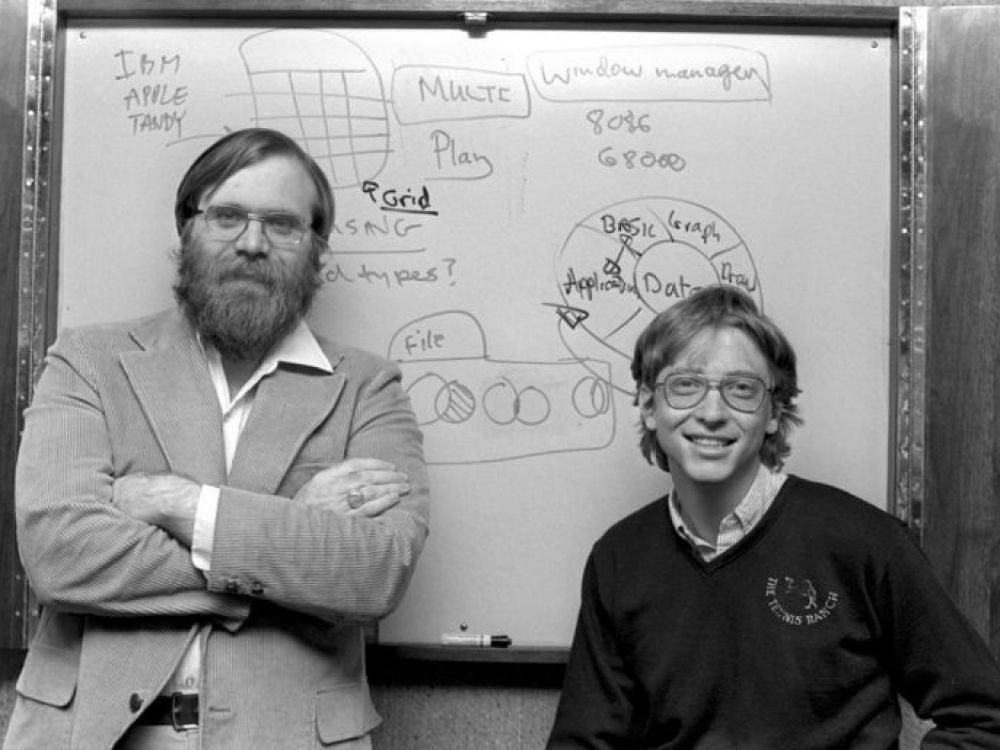 Microsoft (qui s’est d’abord appelé Micro-Soft) est fondé le 4 avril 1975 par Paul Allen, alors âgé de 22 ans, et Bill Gates, 20 ans, tous deux étudiants à Harvard. Leur premier coup : développer l’interpréteur Basic de l’Altaïr 8080. Après le Micral en 1972, il s’agit d’un des tous premiers micro-ordinateurs vendu dans le commerce. Embarquant un microprocesseur Intel, il était initialement limité au langage assembleur. Dans la foulée, les deux fondateurs installent leur société dans un motel d’Albuquerque au Nouveau-Mexique (à quelques pas du siège de MITS, constructeur de l’Altaïr).