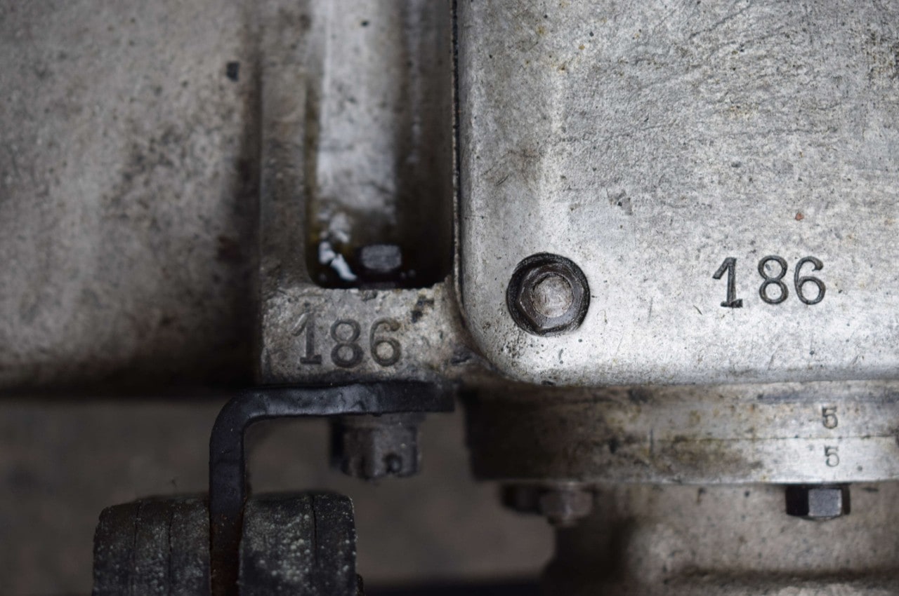 – Pont arrière : Il est étonnement gravé “186”. Ce “numéro gagnant” a sans doute été gravé par le mécanicien anglais, John Barton, quand la voiture est passée dans son atelier. Il avait en effet confié à “La Vie de L’Auto” et à “Rétroviseur” : “Le pont était du Type 35 et je l’ai remplacé par un pont de Type 43″… Il a sans doute poussé le zèle jusqu’à faire coïncider le numéro du pont avec celui de la boîte… Lorsque la voiture était encore à Cannes, le pont portait le numéro 5 mais il n’était déjà pas d’origine Type 43 : en effet, sa face supérieure portait la lettre “H”, qui n’existe pas sur les carters de Type 43, ni même sur les ponts de Type 35. Ainsi, la pièce échangée en Angleterre n’était de toute façon pas conforme au modèle.