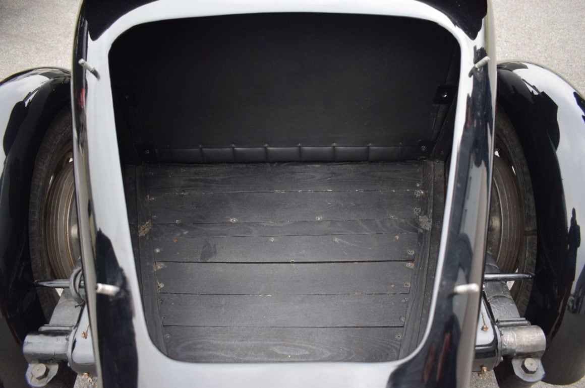 – Carrosserie : Il s’agit d’un torpédo 3/4 places, Grand Sport. Neuve et de bonne facture, la carrosserie a été copiée sur une très bonne Type 43 (châssis 43279), non restaurée et qui avait été découverte dans l’Aisne dans les années 1970. Elle avait séjourné quelque temps chez Pierre Prieur, de Paris, qui avait pu en prendre les cotes. Il avait fait réaliser une carrosserie qu’il destinait à une voiture qu’il venait de trouver, en pièces et en châssis nu. Mais la caisse copiée ne fut jamais montée par Pierre Prieur qui a fini par la céder, avec les pièces dont il disposait, à un collectionneur de la région de Tours. Ce dernier a vendu la carrosserie un peu plus tard au collectionneur cannois mentionné plus haut. La planche de bord est neuve. Tous les instruments sont conformes au modèle et certains sont anciens.