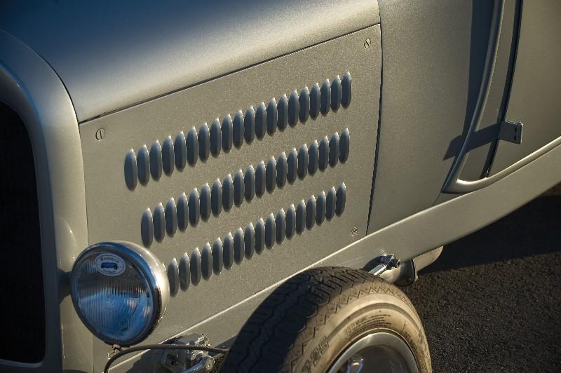 Boyd hand-shaped a beautiful three-piece hood, louvered the side panels, then mated it to a Model A grille shell that was devoid of any badges and a filler cap.