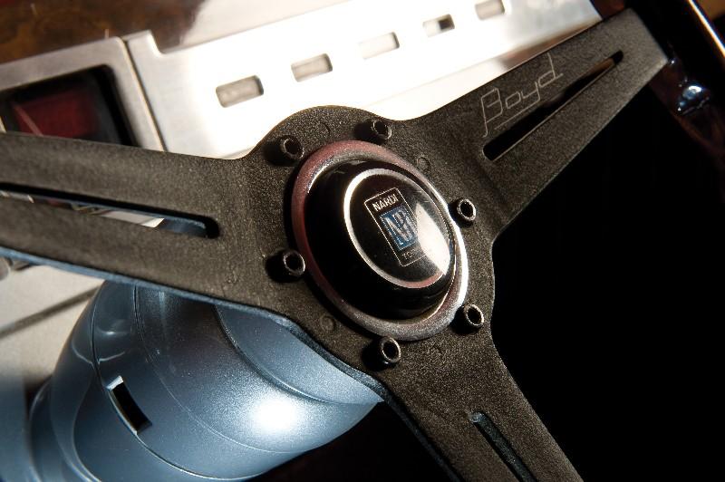 A wood-rimmed three-spoke steering wheel complemented the dash.