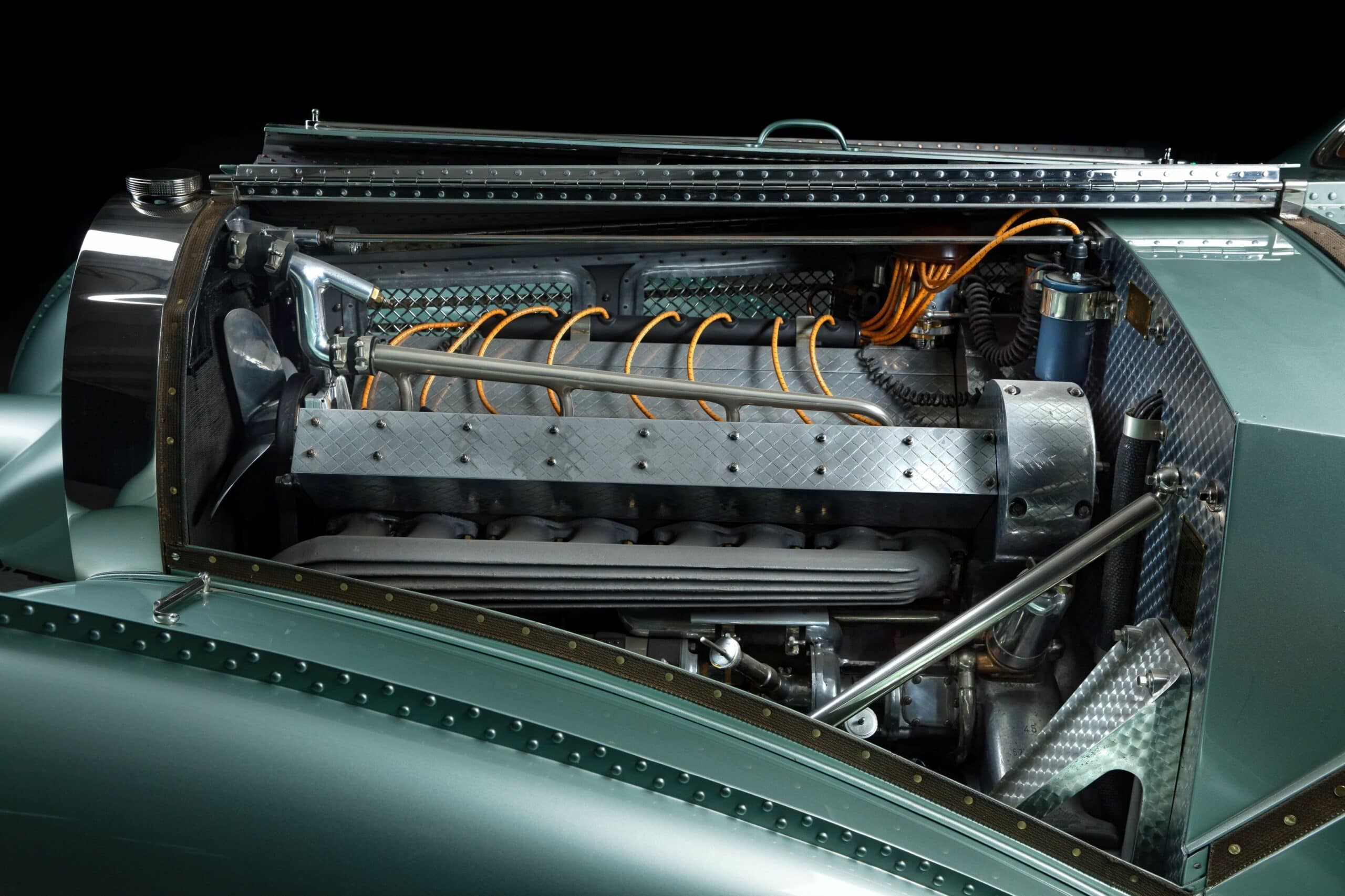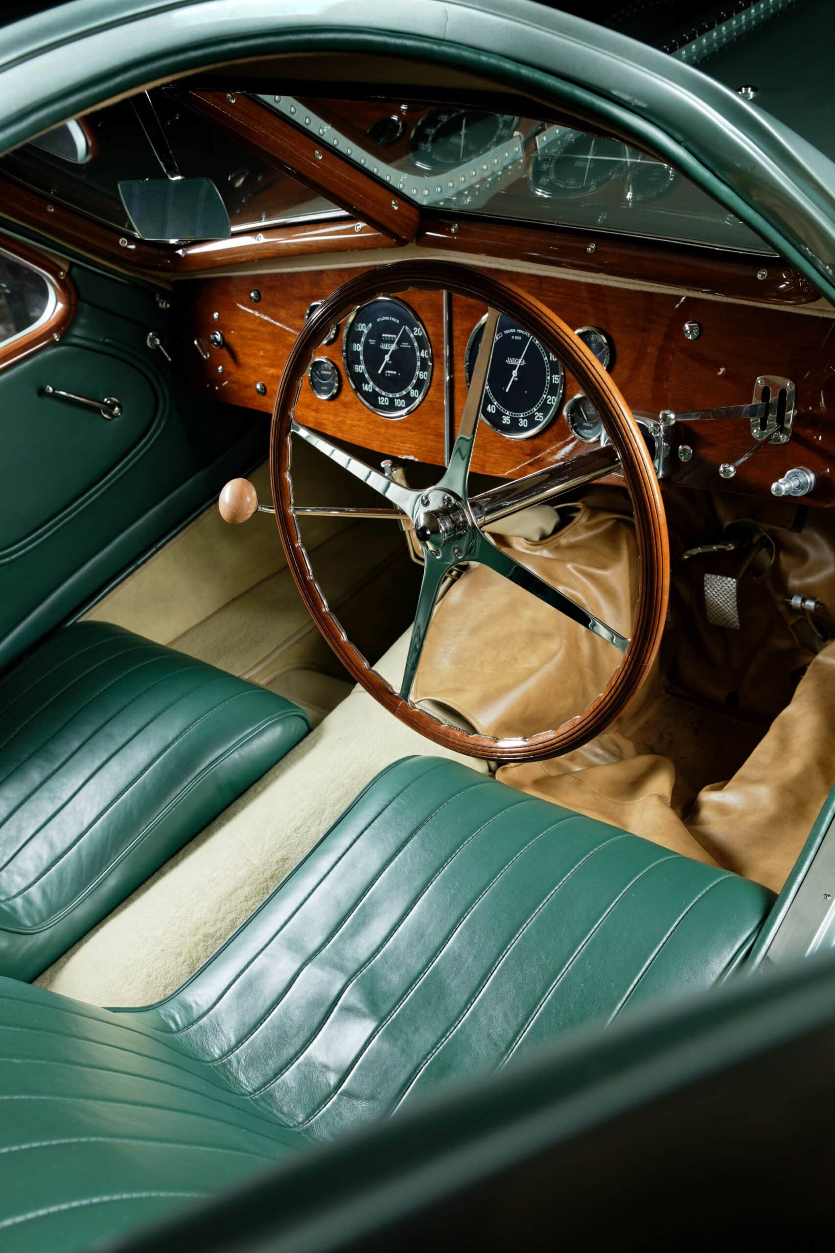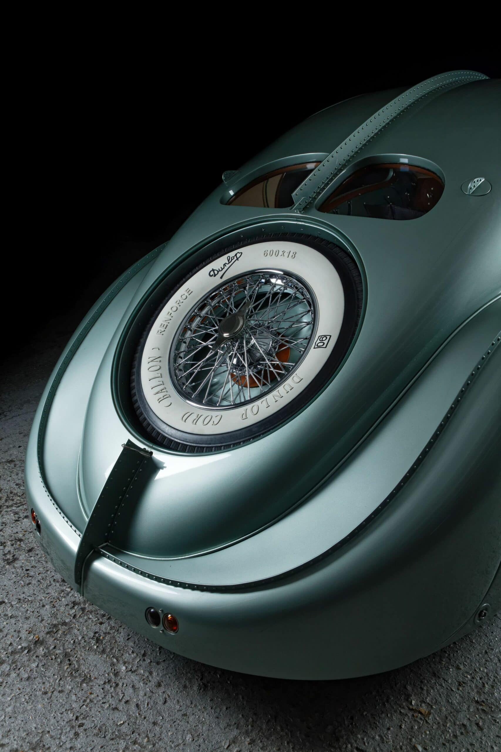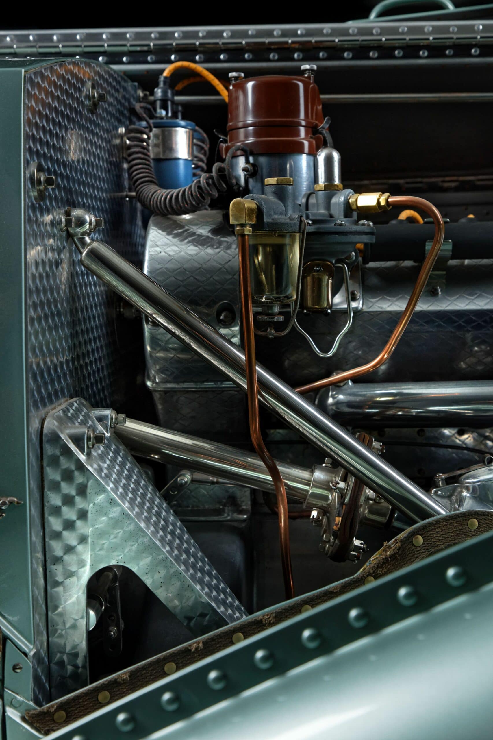 Pour la carrosserie, ils ont analysé à l’ordinateur toutes les photos dont ils disposaient pour reconstituer les dimensions les plus exactes possibles de la voiture, avec tous ses détails de fabrication, y compris la position des rivets sur l’arête centrale et le dessin des pneus à flancs blancs. A l’aide de gabarits, la carrosserie a été ensuite formée en Elektron, processus particulièrement difficile avec ce matériau délicat. L’intérieur a été recréé, avec sa planche de bord en bois et ses sièges tubulaires habillés de cuir.
