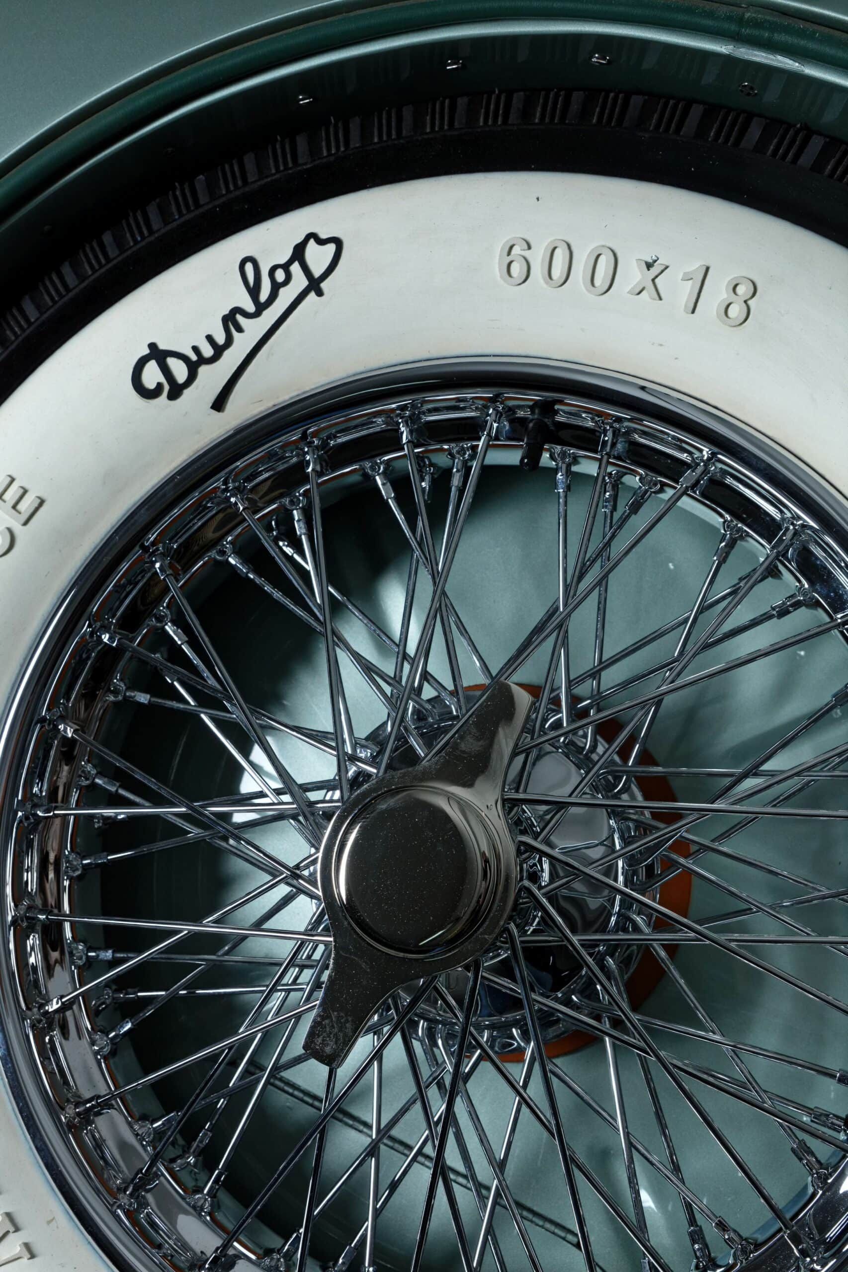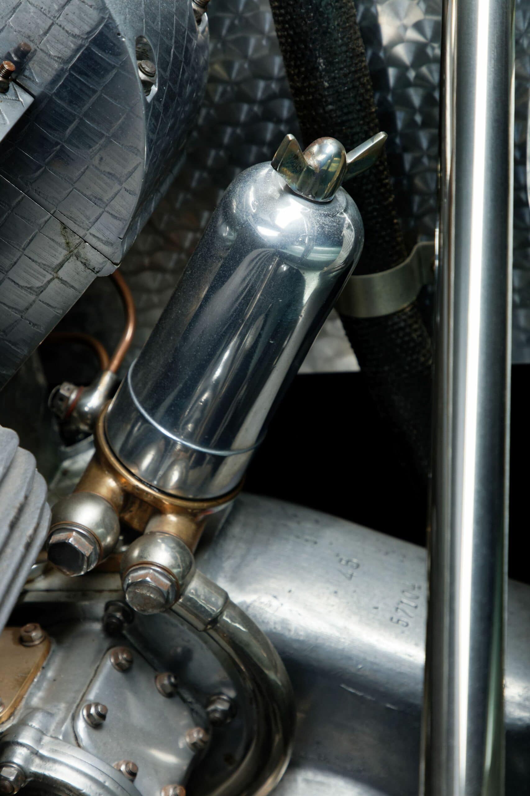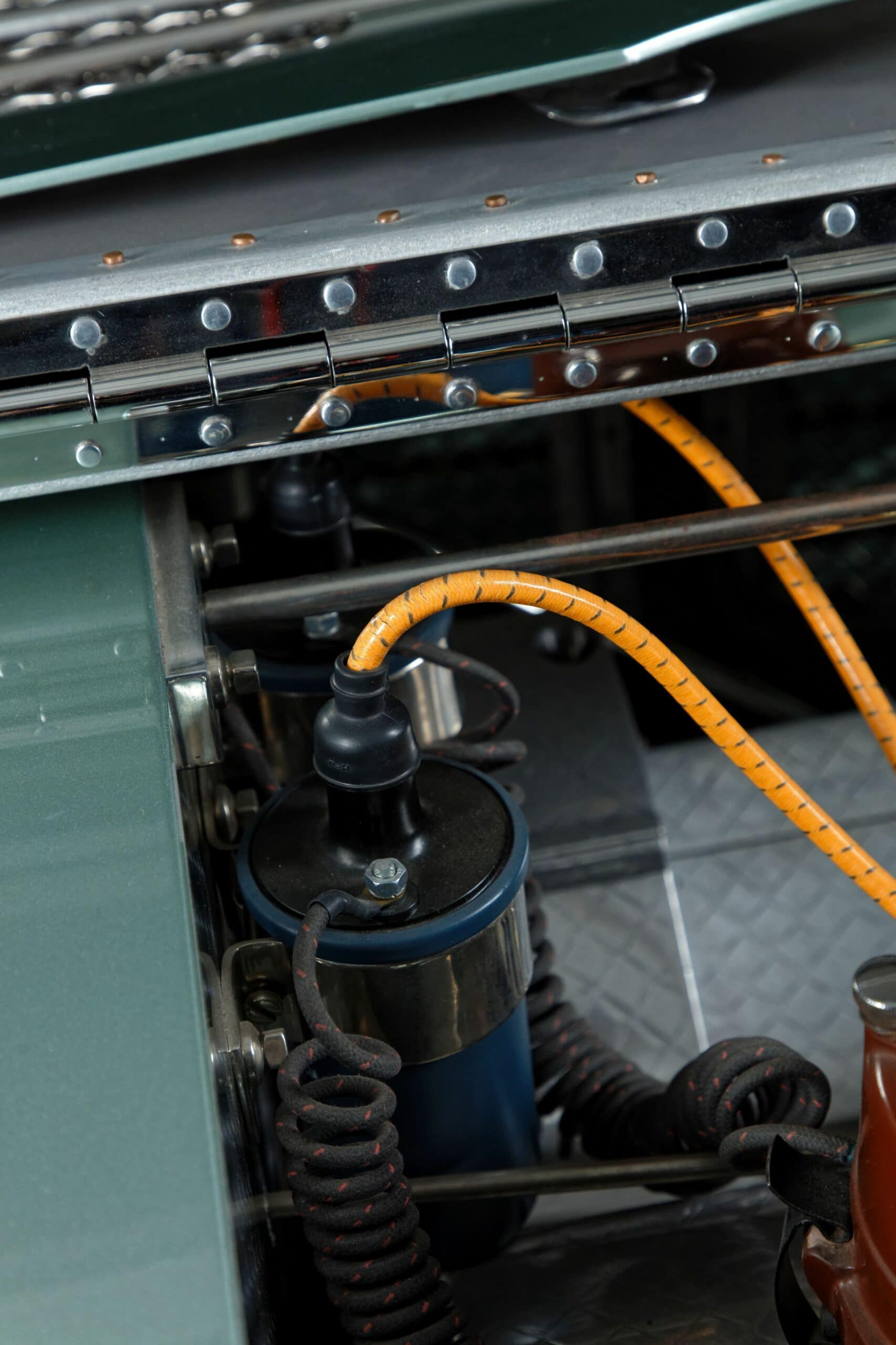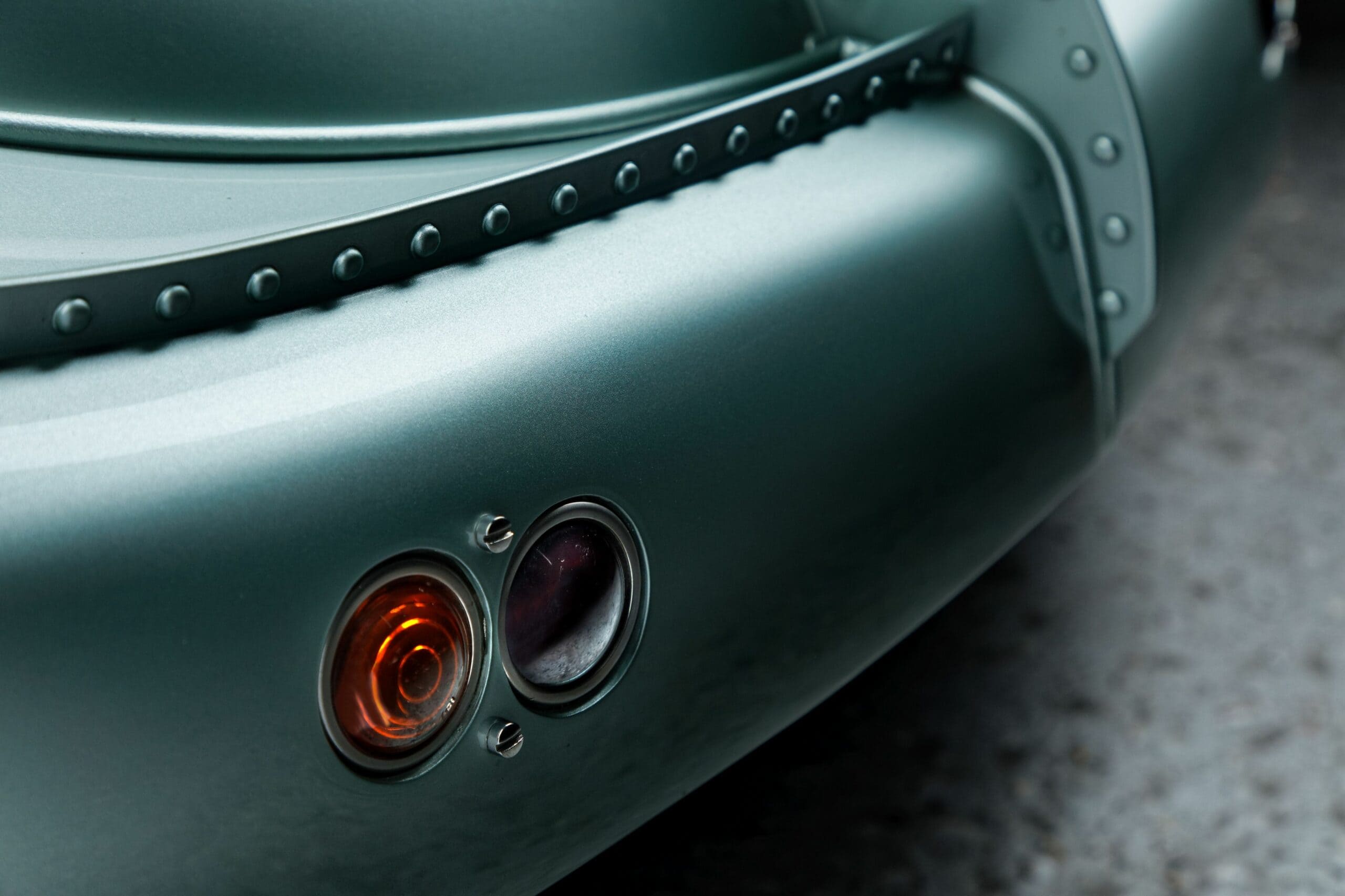 Pour la carrosserie, ils ont analysé à l’ordinateur toutes les photos dont ils disposaient pour reconstituer les dimensions les plus exactes possibles de la voiture, avec tous ses détails de fabrication, y compris la position des rivets sur l’arête centrale et le dessin des pneus à flancs blancs. A l’aide de gabarits, la carrosserie a été ensuite formée en Elektron, processus particulièrement difficile avec ce matériau délicat. L’intérieur a été recréé, avec sa planche de bord en bois et ses sièges tubulaires habillés de cuir.