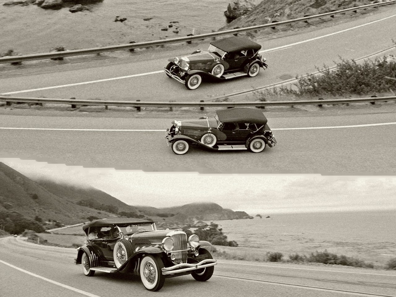 – Je disais donc, que…, bref…, tout cela a un prix : sortie de l’atelier de carrosserie le prix s’élève à environ 14.000 Dollars…, à comparer avec le prix d’une Ford Model T milieu de gamme : 650 Dollars…, à la suite de difficultés financières, la société a donc été rachetée en 1926 par…, oui, je l’ai déjà dit, excusez-moi, j’ai perdu le fil… , ah oui, par Errett Lobban Cord, qui en fait la marque de prestige de son groupe automobile. Sous son impulsion, Duesenberg crée son chef-d’œuvre, la Duesenberg J, qui est présentée au salon de New York de 1929 et qui est rapidement choisie par les vedettes d’Hollywood comme Clark Gable ou Gary Cooper…, ce succès décide Duesenberg à commander les composants pour la fabrication de 500 voitures…, les premiers modèles finis sont livrés aux clients en mai 1929…, quelques semaines seulement avant le mardi noir qui va déclencher une crise économique mondiale !