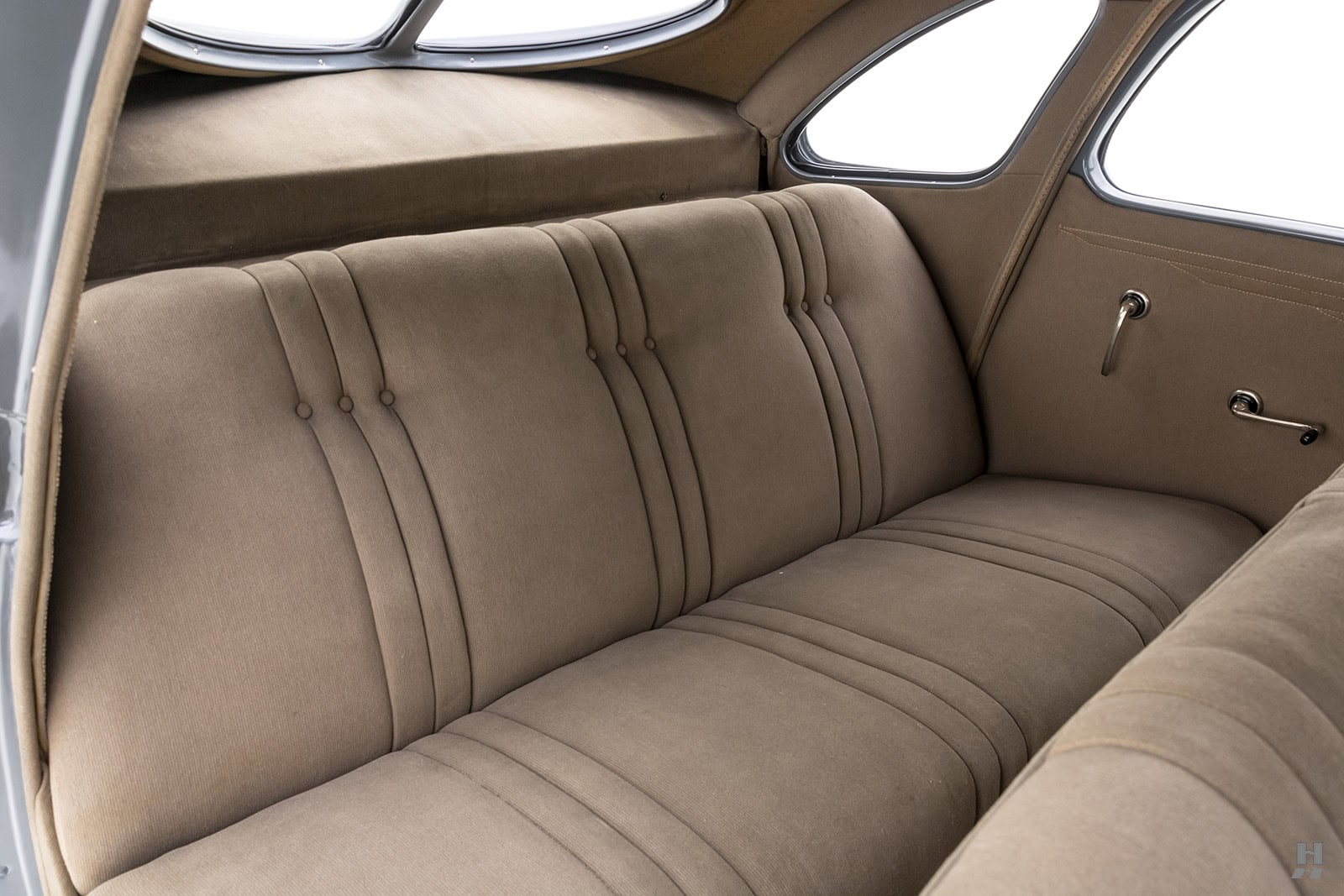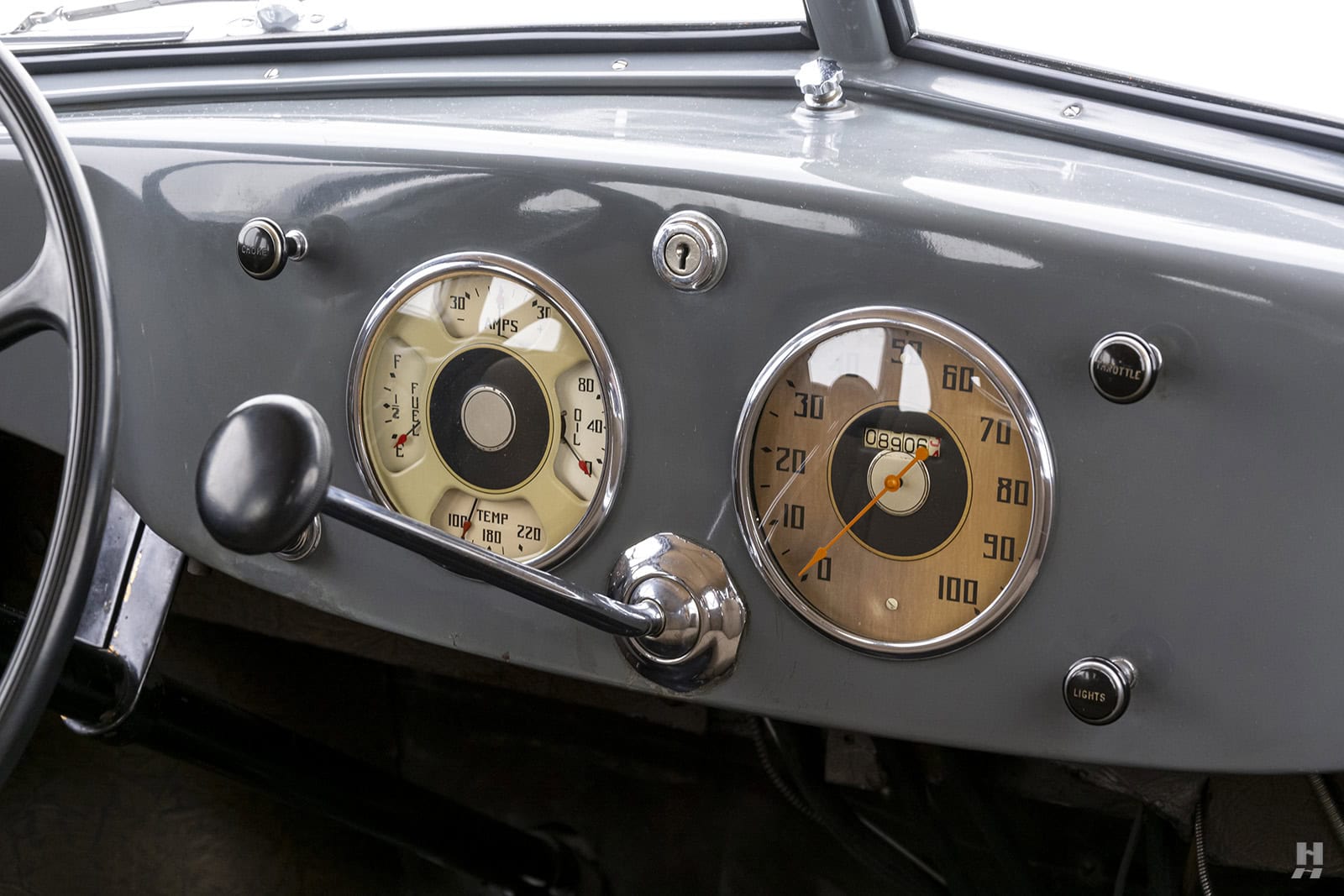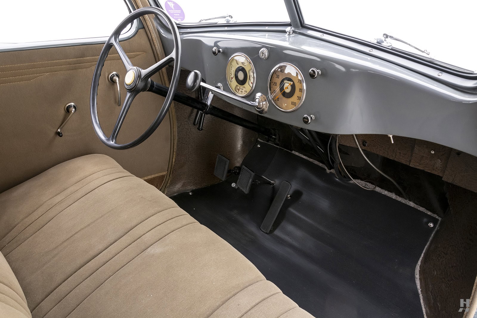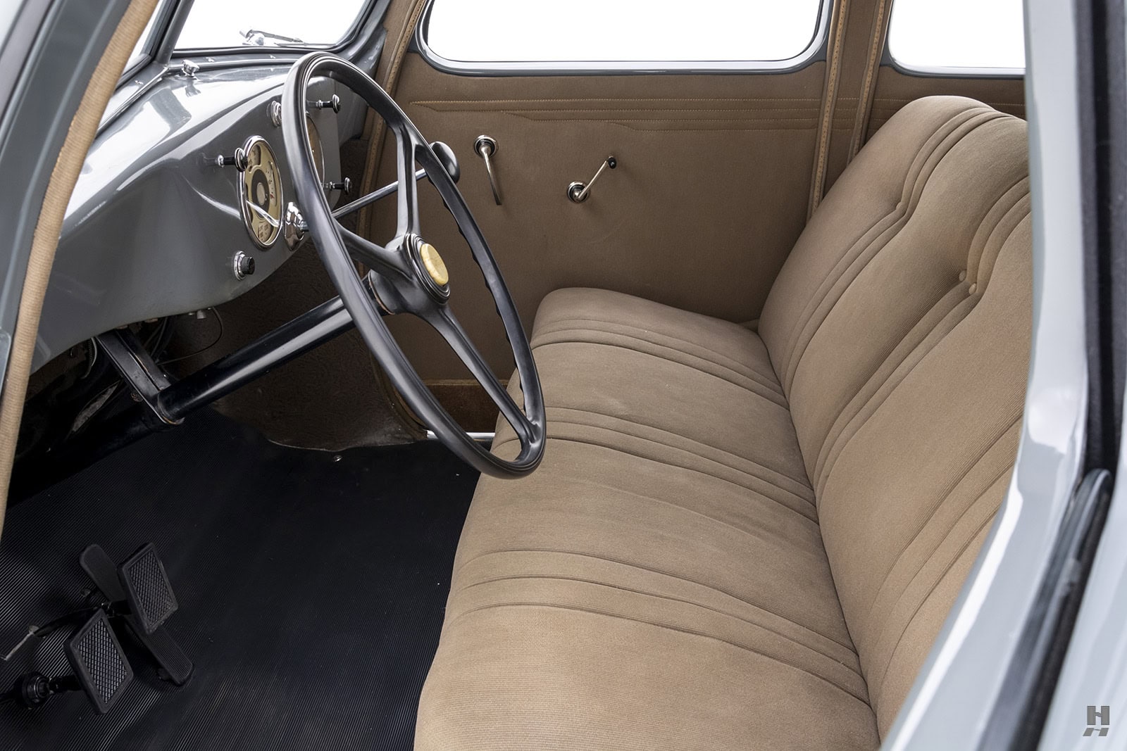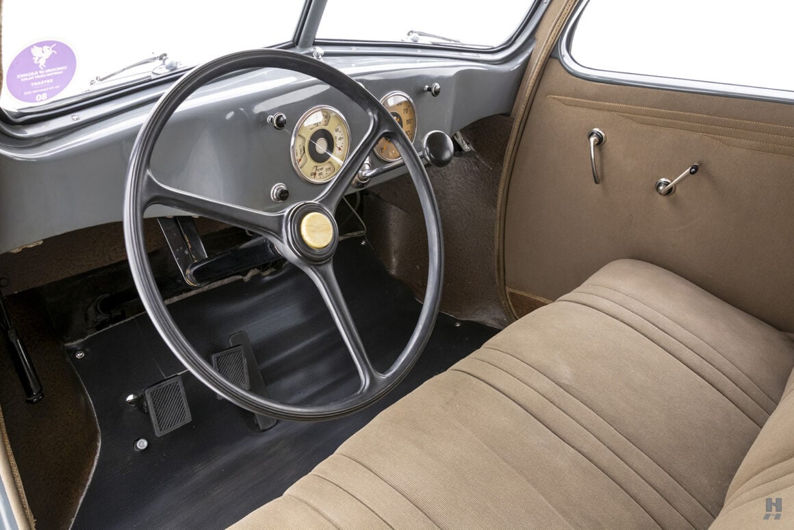 Le plancher plat, non obstrué par une bosse de transmission, offre beaucoup d’espace disponible pour tous les occupants. L’intérieur, soigneusement conservé, est 100% d’époque jamais restauré, s’y trouve un levier de vitesses articulé innovant monté sur le tableau de bord, permettant un changement de vitesse traditionnel à trois vitesses sans entraver l’espace pour les jambes des passagers avant. Le tableau de bord épuré comprend un volant à trois branches et des compteurs circulaires bien rangés/centrés pour une visibilité facile et confortable.