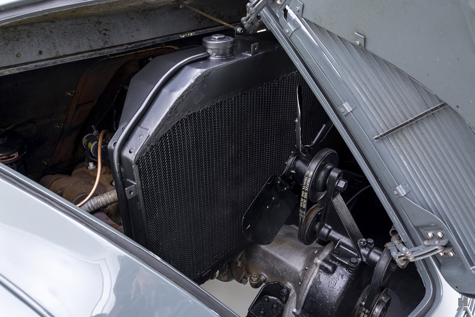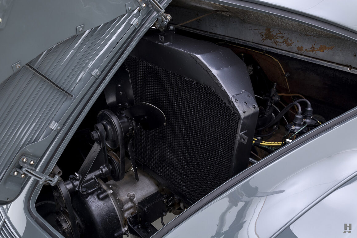 Elle dispose en effet d’un moteur en “X“ (je vous explique plus loin) positionné à l’arrière avec une construction de carrosserie unifiée entièrement en acier sans châssis, une véritable rareté au milieu des années 1930. Rien que par ses proportions, plus basses, plus étroites et plus compactes que les berlines typiques des années 1930, la Hoffman X-8 se démarque. Rod Hoffman a envisagé une disposition du moteur arrière comme la solution pour une répartition idéale du poids, un freinage amélioré, un confort accru des passagers et une réduction du bruit du moteur dans l’habitacle.