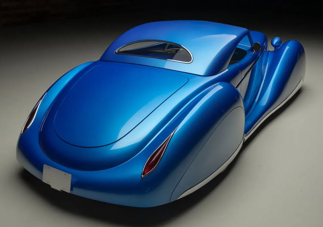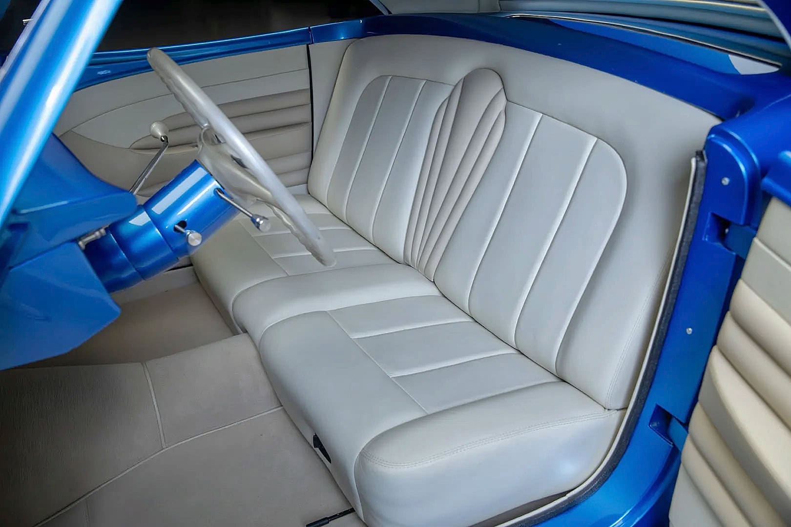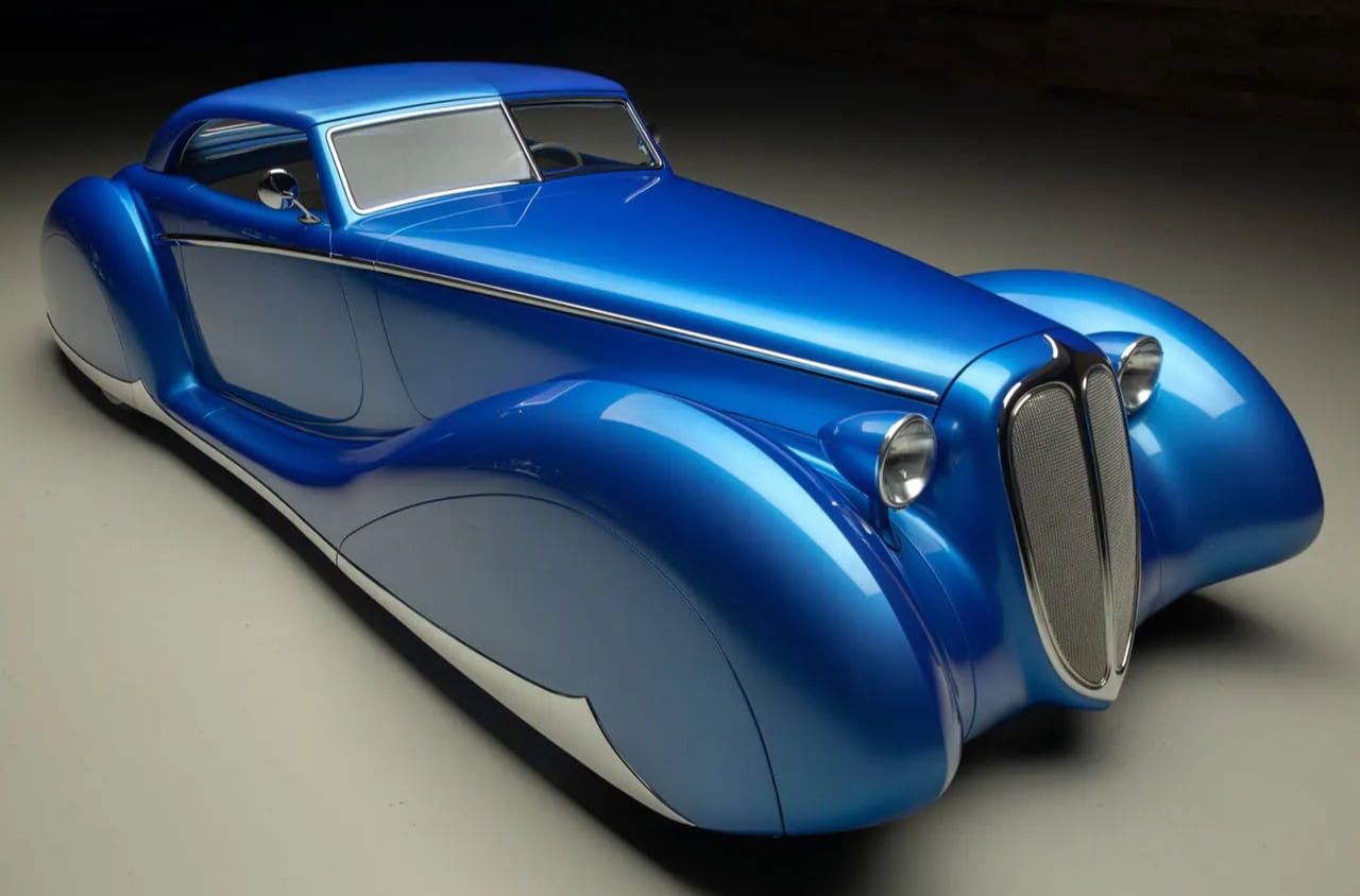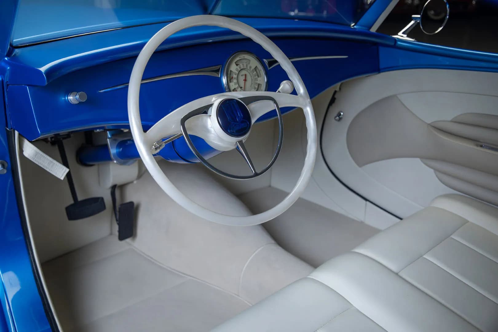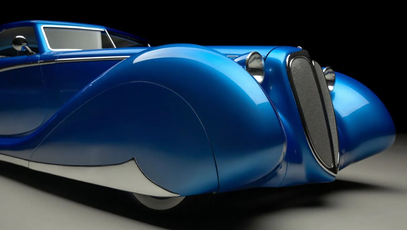 Cela en utilisant uniquement les meilleurs du secteur (sic !). Le chrome plaqué laiton a été réalisé par “Sherms”, les vitrages retravaillés de gravures par “Vic” de chez “Galinda Glass”, et le câblage façon fusée lunaire par “Ron Francis”. Dans le même exemple, les feux arrière et la calandre avant dominante ont été façonnés à la main pour être placés avec une précision chirurgicale… La peinture bleue “Tahitienne transcendante et joyeuse” a été appliquée par “Hillview Customs” et “Benny Flores”, complétant et mettant en valeur à merveille les lignes sculptées exquises à la française évoquant une Delahaye.