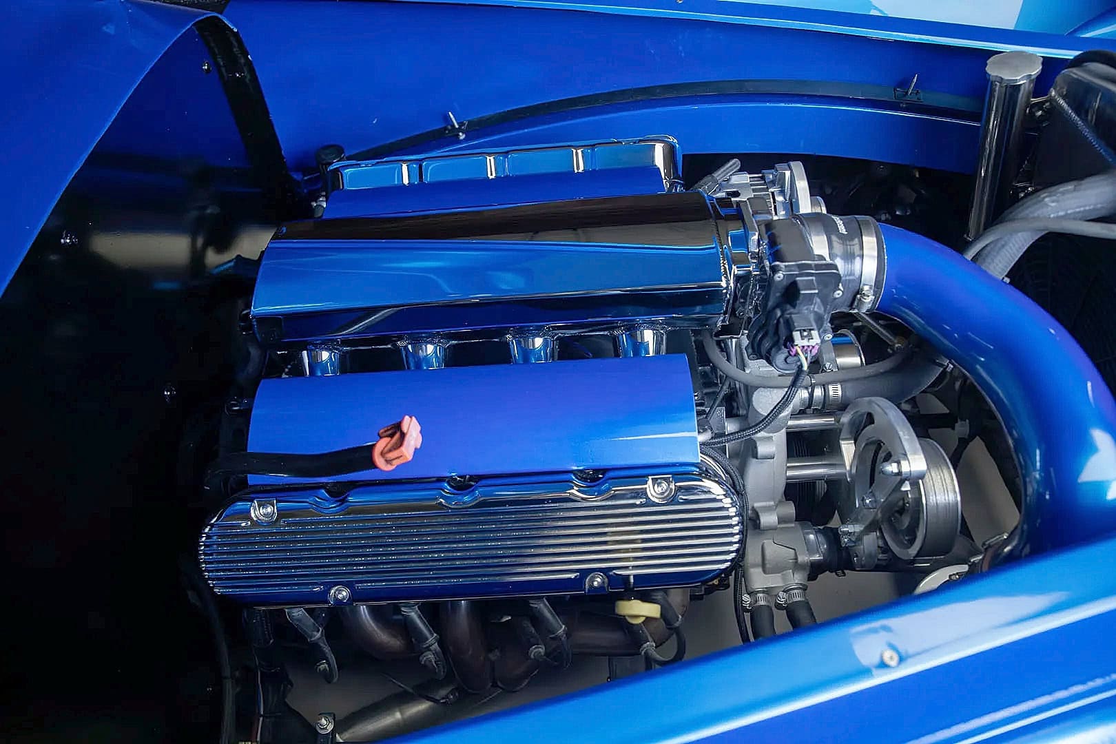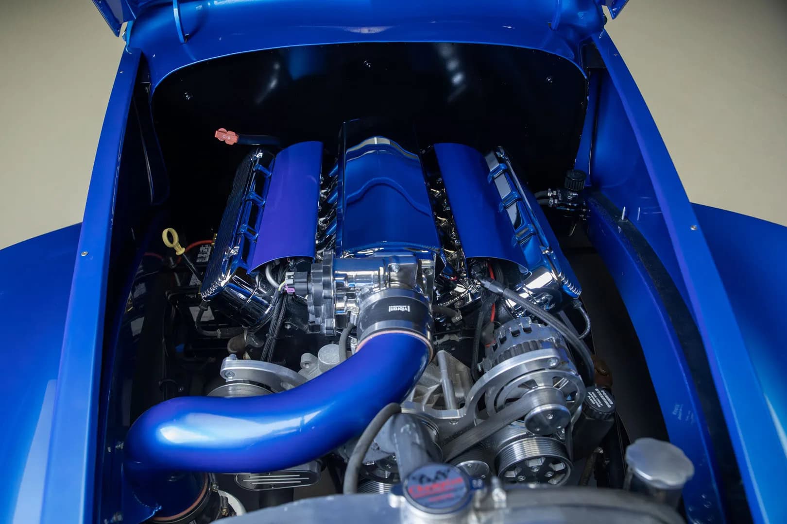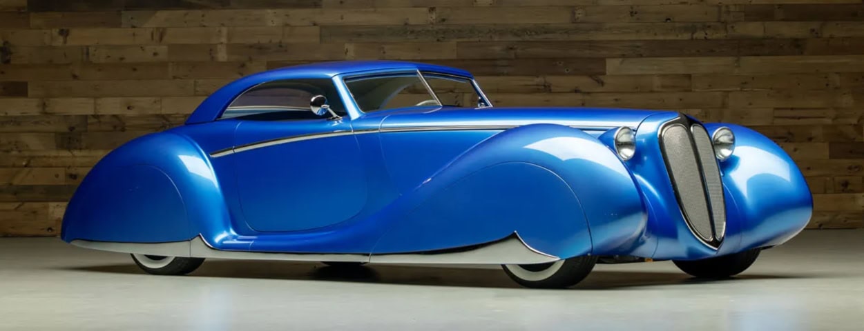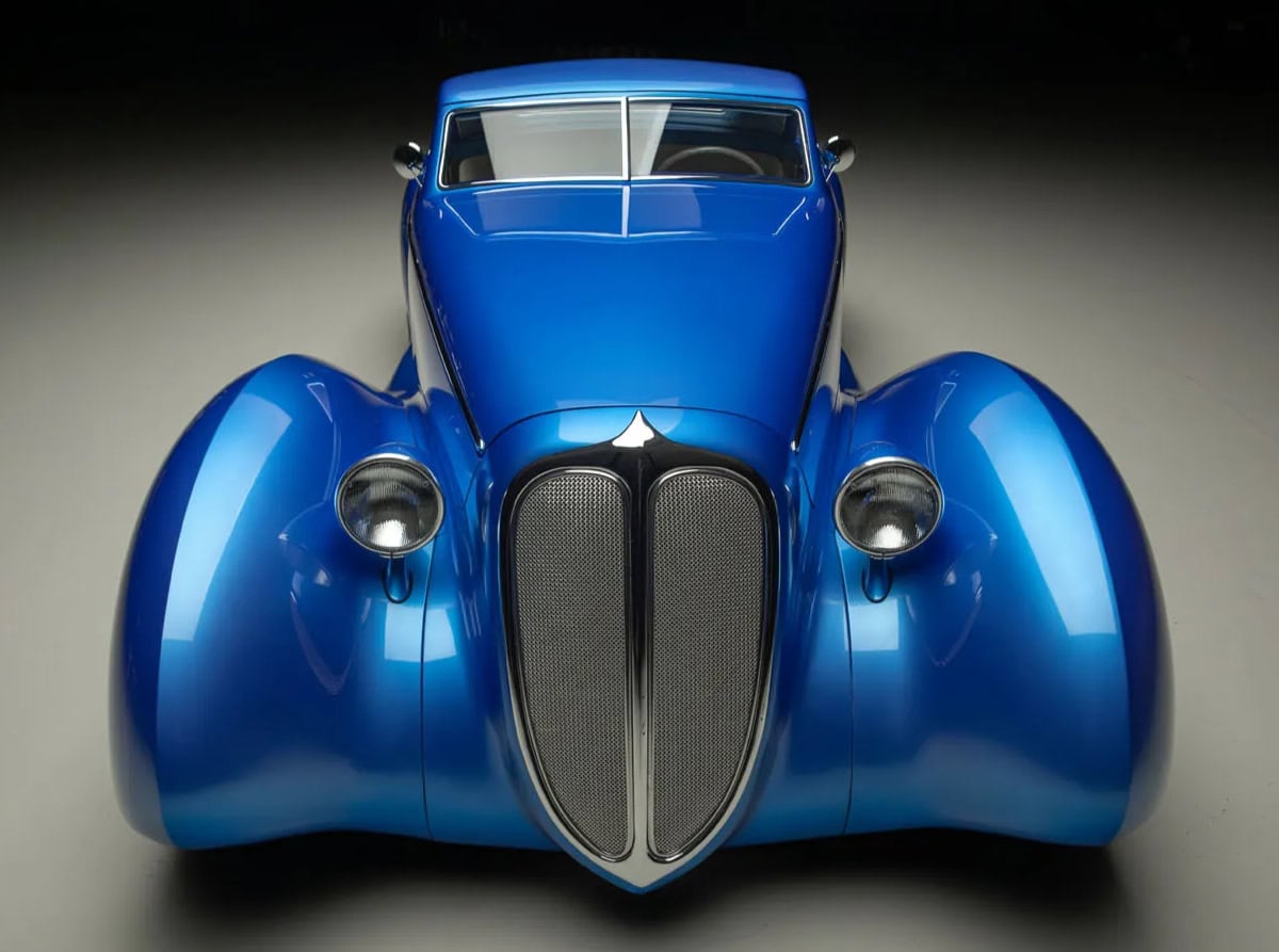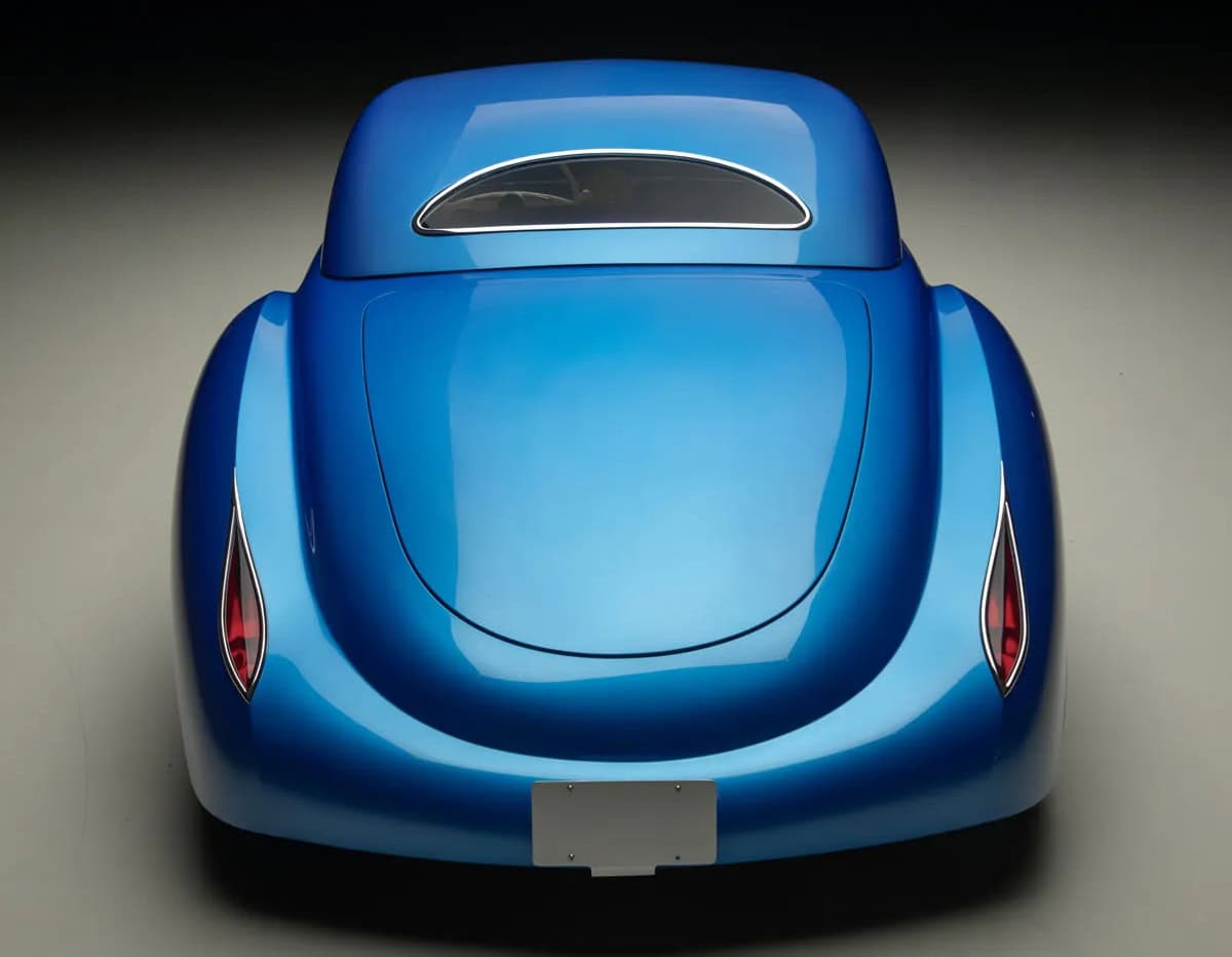 Cela en utilisant uniquement les meilleurs du secteur (sic !). Le chrome plaqué laiton a été réalisé par “Sherms”, les vitrages retravaillés de gravures par “Vic” de chez “Galinda Glass”, et le câblage façon fusée lunaire par “Ron Francis”. Dans le même exemple, les feux arrière et la calandre avant dominante ont été façonnés à la main pour être placés avec une précision chirurgicale… La peinture bleue “Tahitienne transcendante et joyeuse” a été appliquée par “Hillview Customs” et “Benny Flores”, complétant et mettant en valeur à merveille les lignes sculptées exquises à la française évoquant une Delahaye.