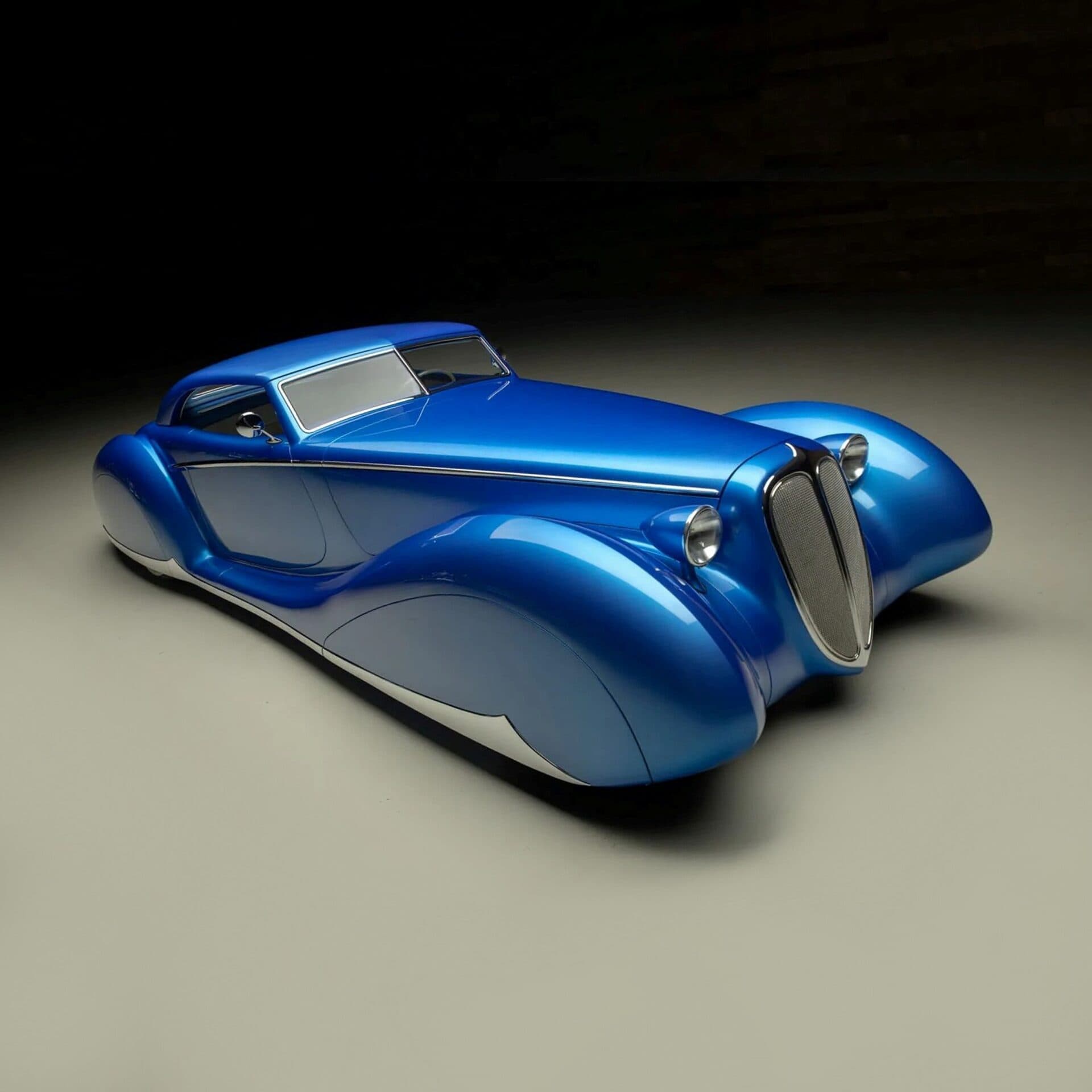 C’est un “HotKustomRodNéoClassicar” unique construit “à la main” et se décrit comme étant le fruit d’un artisanat d’antan mêlé à la performance moderne, conjugué à un style français Belle époque avec une attitude américaine… Construit sur un châssis Art Morrison destiné aux Hot Rod’s B32, la neuvième merveille du monde (selon Donald Trump qui a commandé une version 4 portes à 6 roues)… est équipée d’une carrosserie entièrement en aluminium façonnée à la main par Luc Deley de Marcel’s Custom Metal, selon un processus complexe, méticuleux, chronophage et abominablement hyper couteux.
